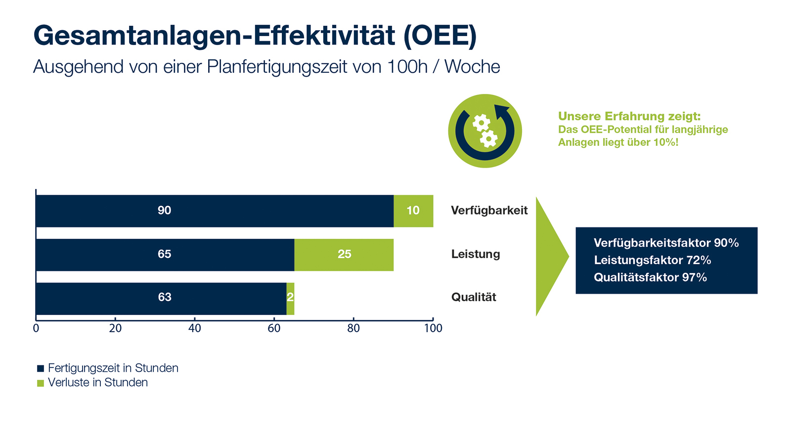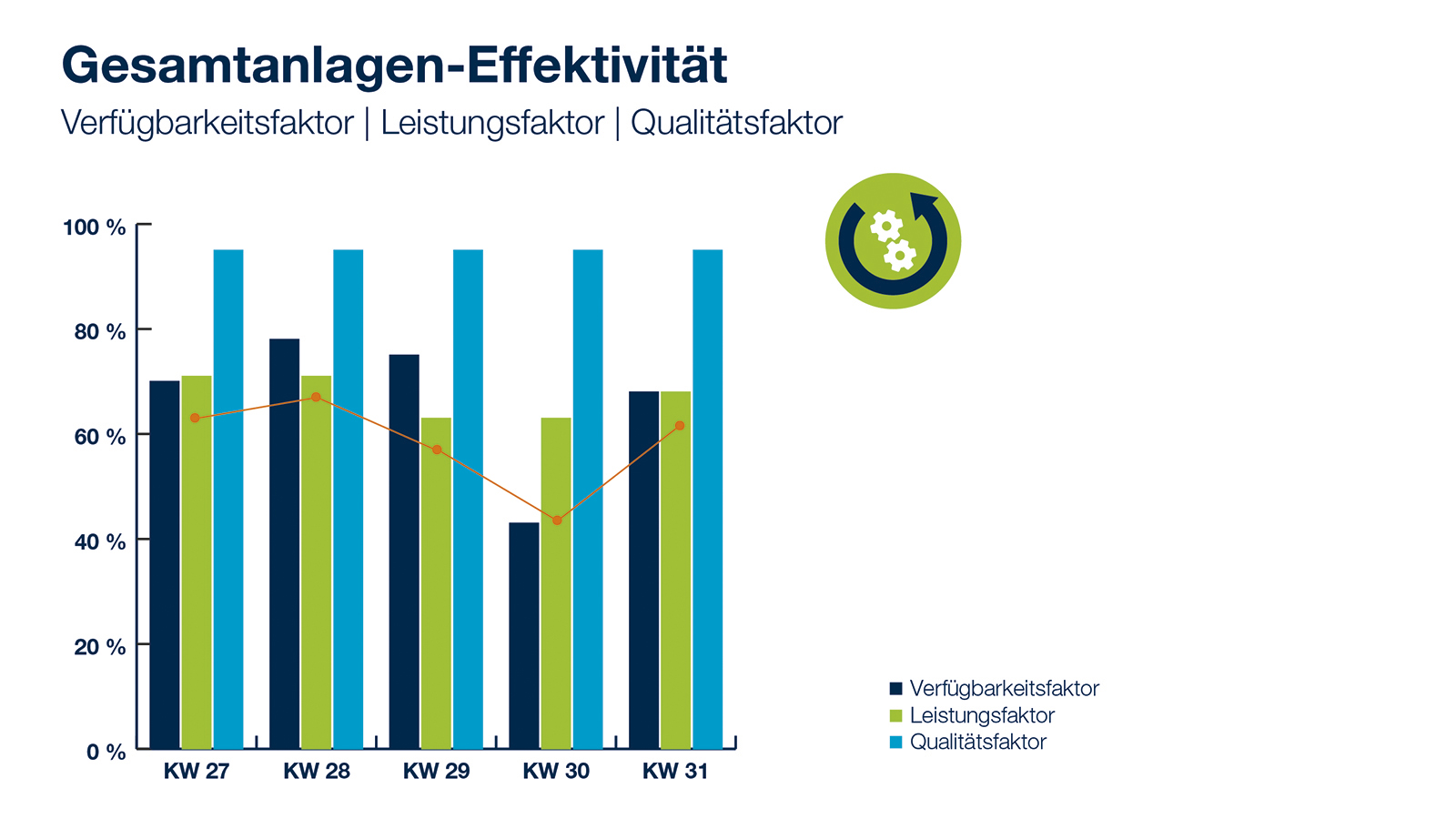 设备综合效率 (OEE) 是一个由可用性、性能和质量等因素组成的关键数字。这一关键数字包含了对生产率有影响的最重要因素,因此也是对流程和系统经济效益有影响的最重要因素。