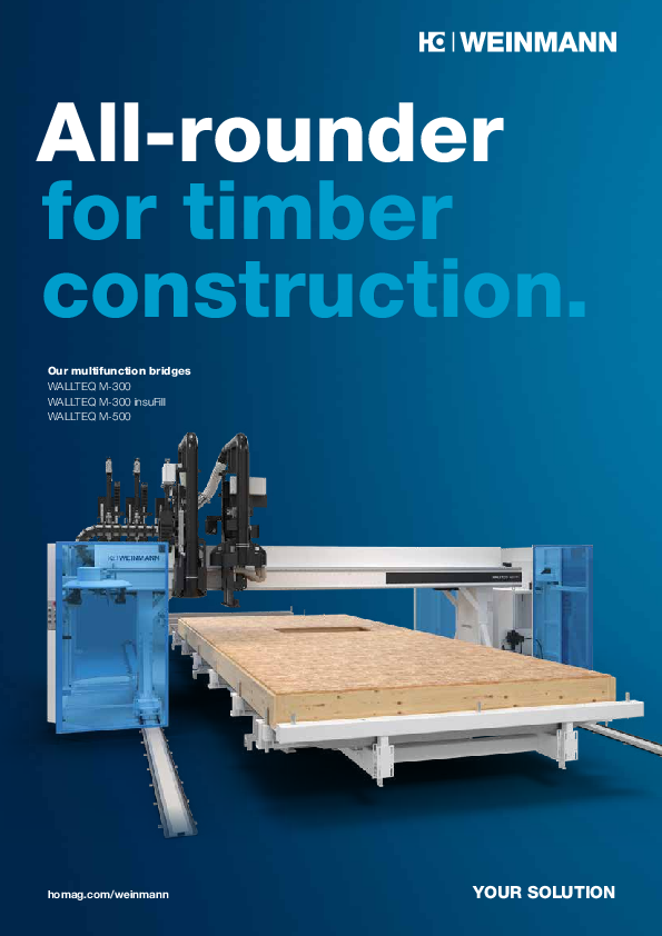 通过 WALLTEQ M-300 insuFill /M-500 多功能桥您能够以半自动或全自动的方式加工木结构建筑构件,例如外墙、屋顶和天花板构件,以及山墙或特殊构件。CNC 控制的多功能桥能够精准的在相应的隔间上方定位送料装置。所有的数据,如位置、形状与尺寸都已储存在 CAD 中,并将通过接口传送至送料装置。
