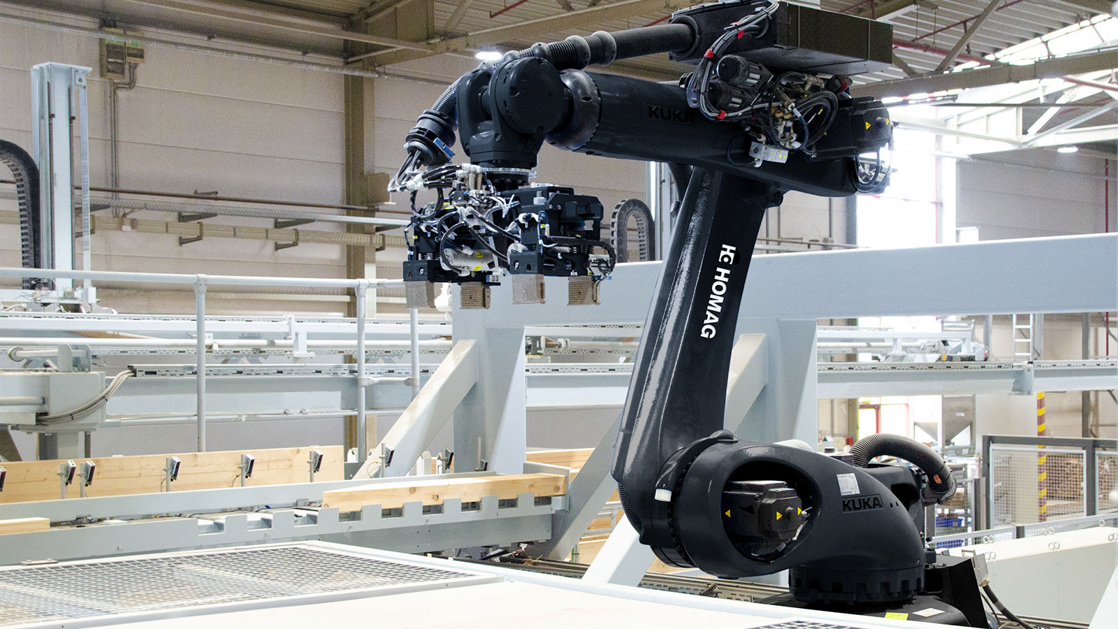 周期短:机器人以每分钟 6 次循环的速度将木材插入桁架。