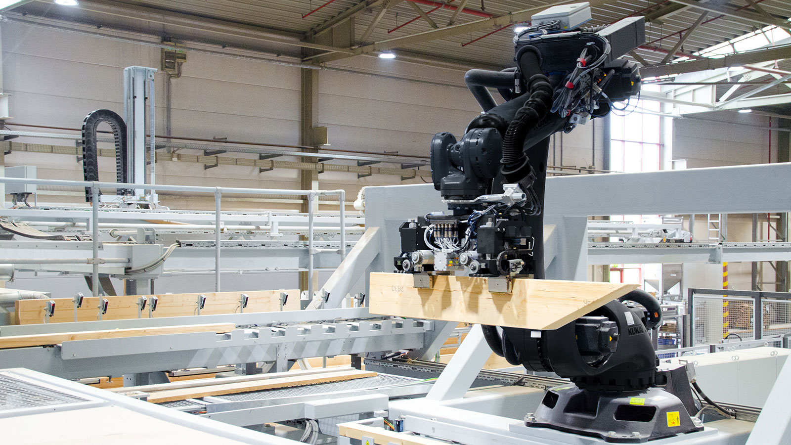 可用率接近 100 %,重复精度高,工件搬运准确无误:作为您可靠的伙伴,机器人能以高度自动化的方式提高木结构生产的经济效益。与桁架工位相结合,机器人可以全自动方式放入腹杆和弦杆,用于带门窗的墙体构件或山形墙等特殊构件。无论是标准腹杆、特殊腹杆,还是上下弦杆,机器人都能以极高的精度自动将各种腹杆放入桁架中。6 轴机器人可以轻松搬运重达 75 kg 的腹杆。