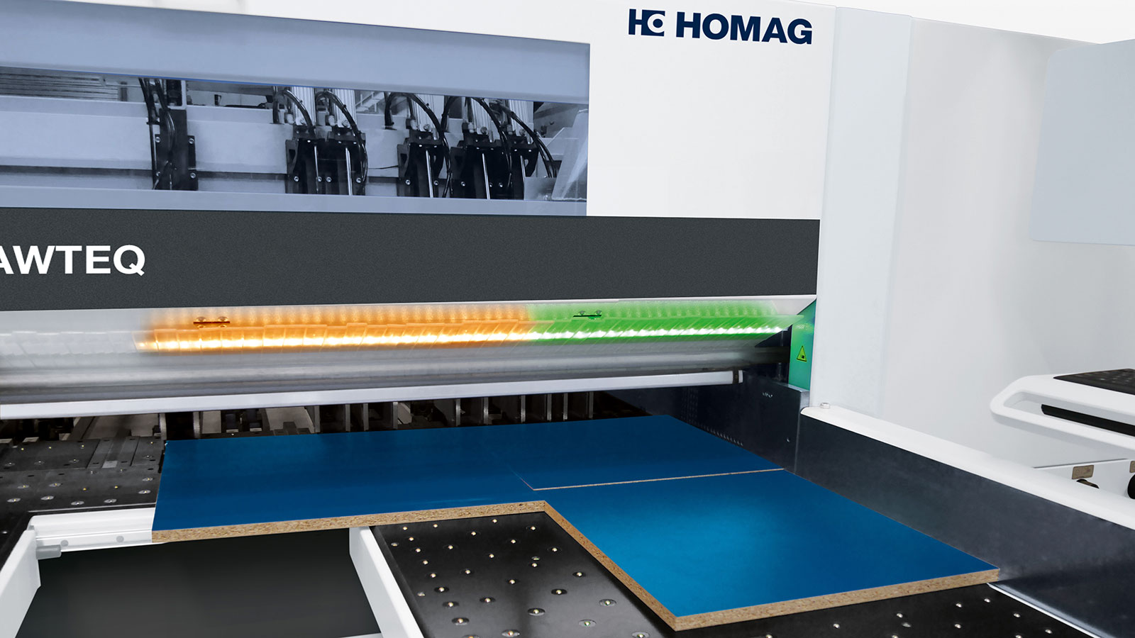 裁板锯 SAWTEQ S-100 的成本仅略高于一台配置完善的开料圆锯,但在切割精度和效率上实现了显著提升。这得益于 HOMAG 的成熟技术以及众多自动化与加工选项。这款裁板锯标配环形防护装置,因此可在后部机床工作台下方提供储物空间。500 mm 宽的气垫工作台不仅提升了操作舒适性,还能确保材料的轻柔放置。