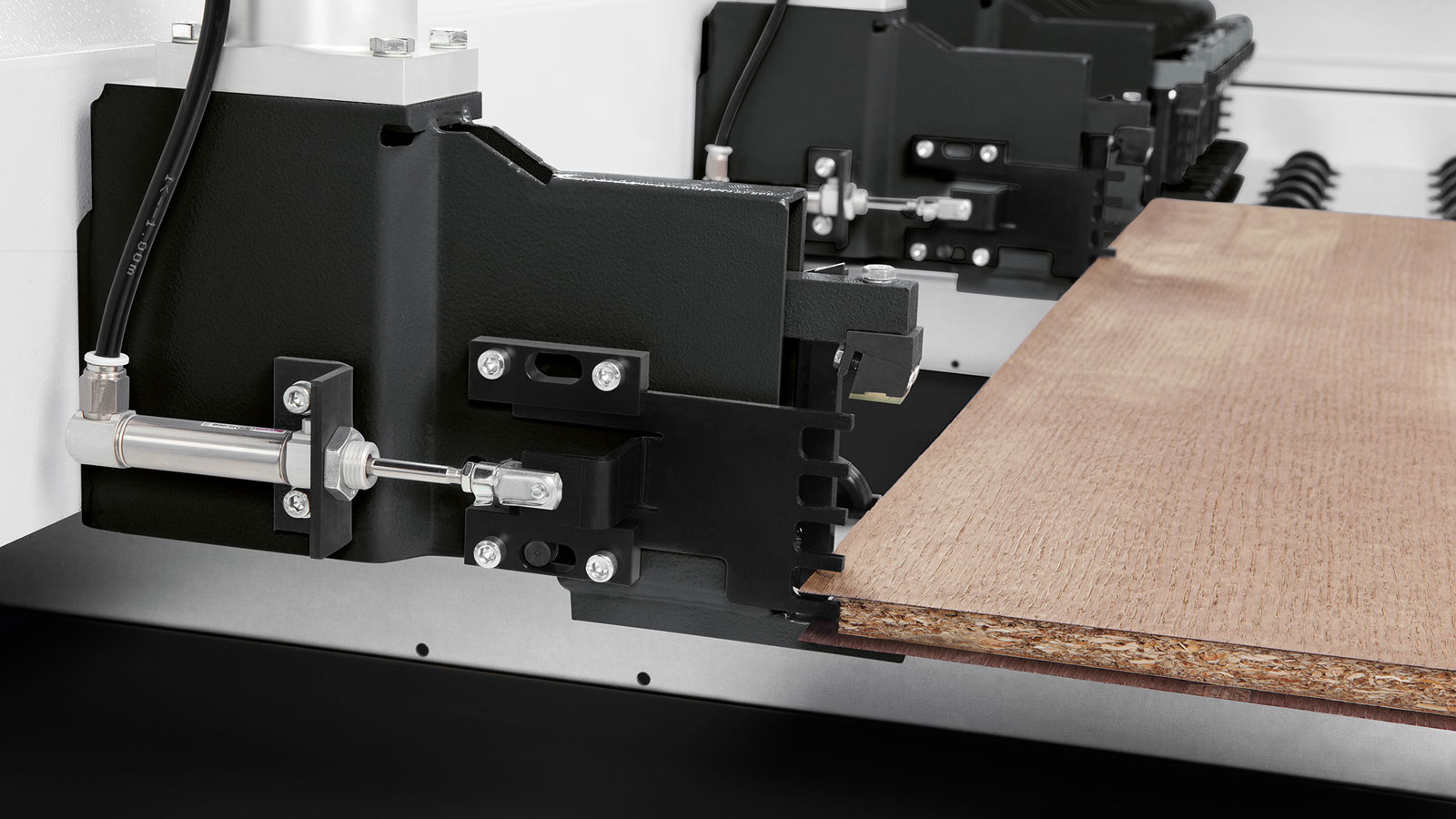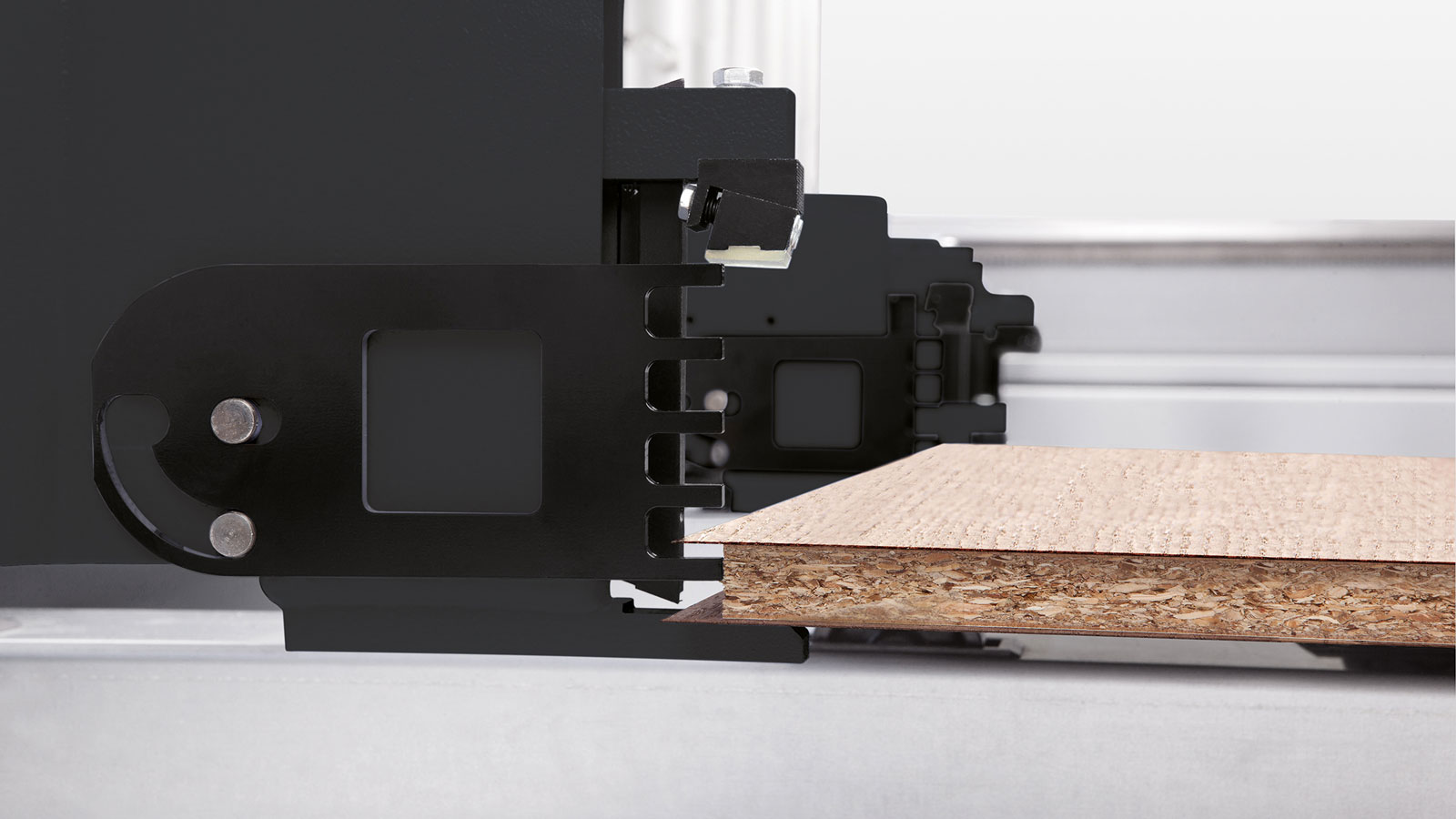 通过前部操作区的两个手动调节器手动调节弹簧夹头和压梁的压力,适用于切割对压力敏感的板材