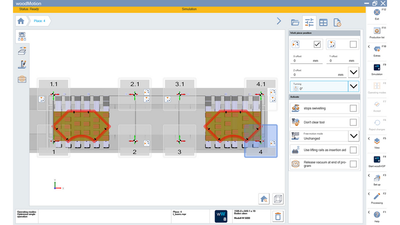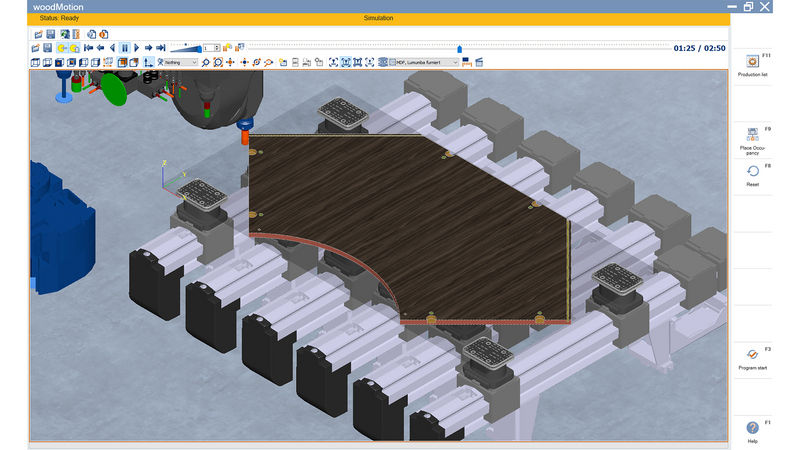 woodMotion 可在办公电脑上模拟机床的工作步骤,并以图形方式显示工件上的加工操作。这样,程序员在工作准备期间就可以检查所有加工步骤,提前识别刀具和夹具之间可能发生的碰撞。这种仿真以带有真实 CNC 内核的虚拟机床为基础,该虚拟机床由客户机床的数据控制。