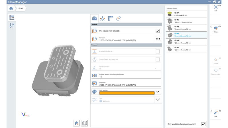 现在可以使用 ClampManager 轻松管理夹具。它取代了之前的 ClampEdit 应用程序。其主要特点是一个基于 powerTouch 技术的全新操作方案。通过基于模板的选择,可以创建新的吸盘类型。设置完成后的吸盘类型可以轻松导出或导入到其他机床中。除了夹具的 3D 模型外,还可显示其碰撞模型。