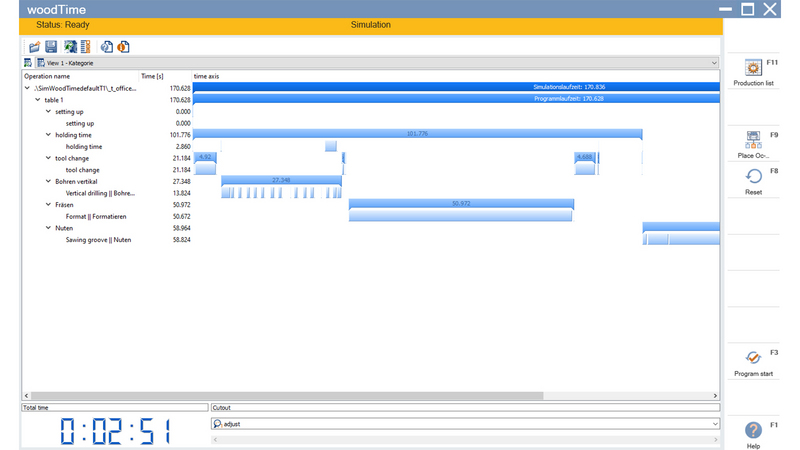 woodTime 可用于确定程序的加工时间。这样一来,客户就能提前知道一项工作在 CNC 机床上需要的时间。在版本 8 中,可以详细测定各个步骤的运行时间,并以甘特图的形式显示出来。此外,woodTime 现在还可用于 PC87 机床。