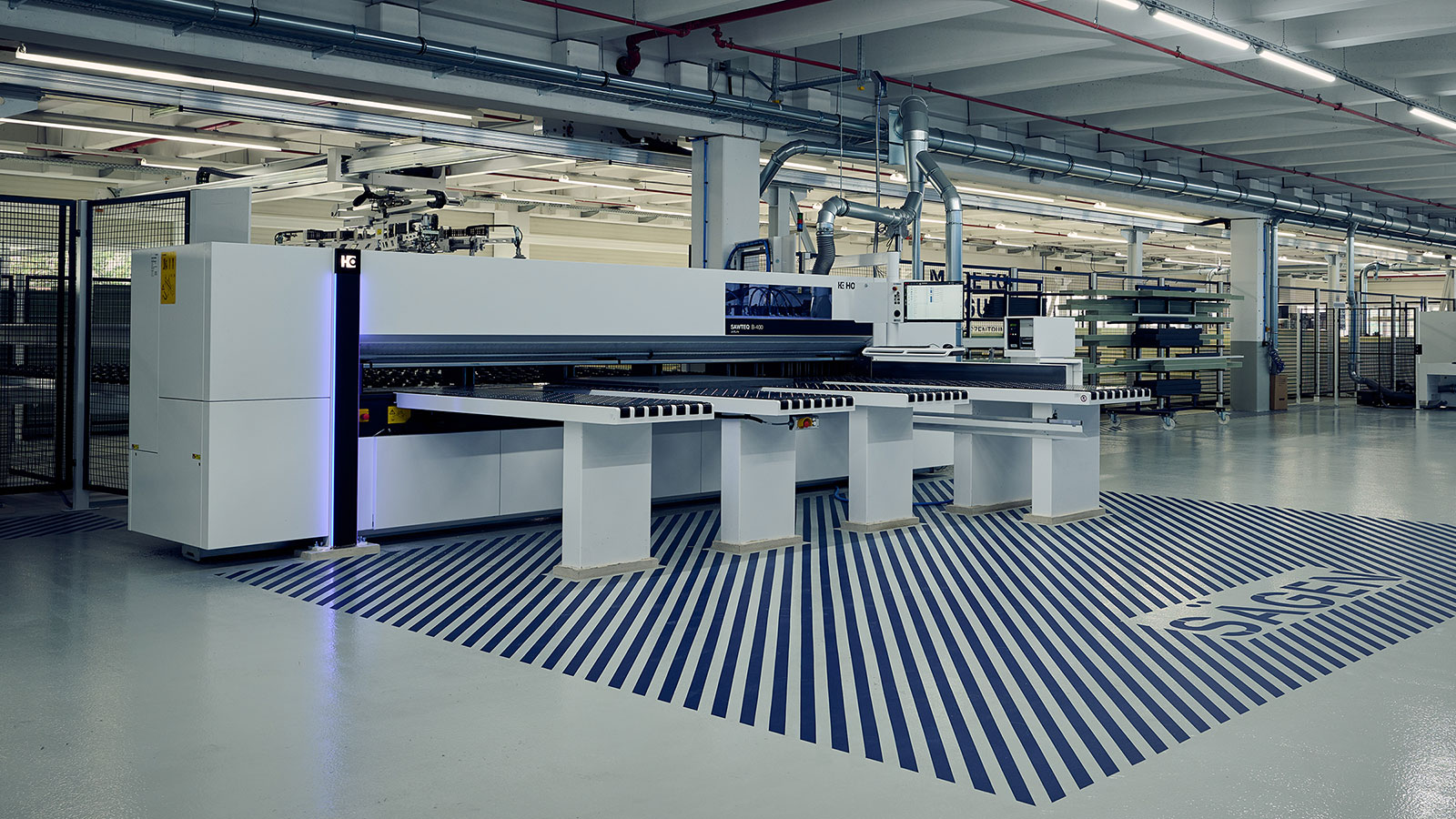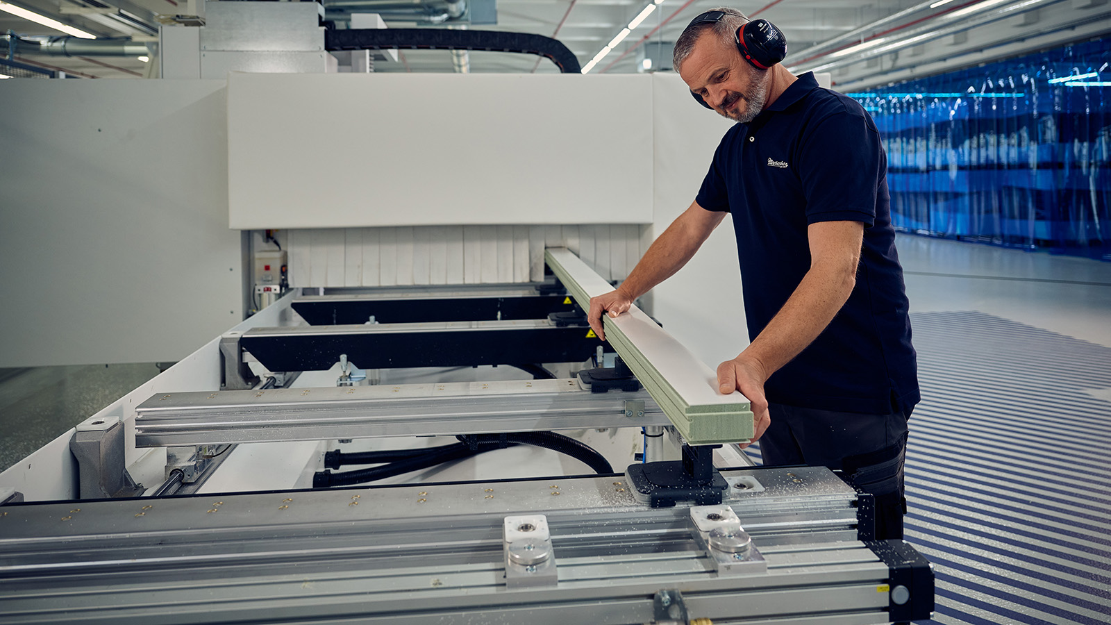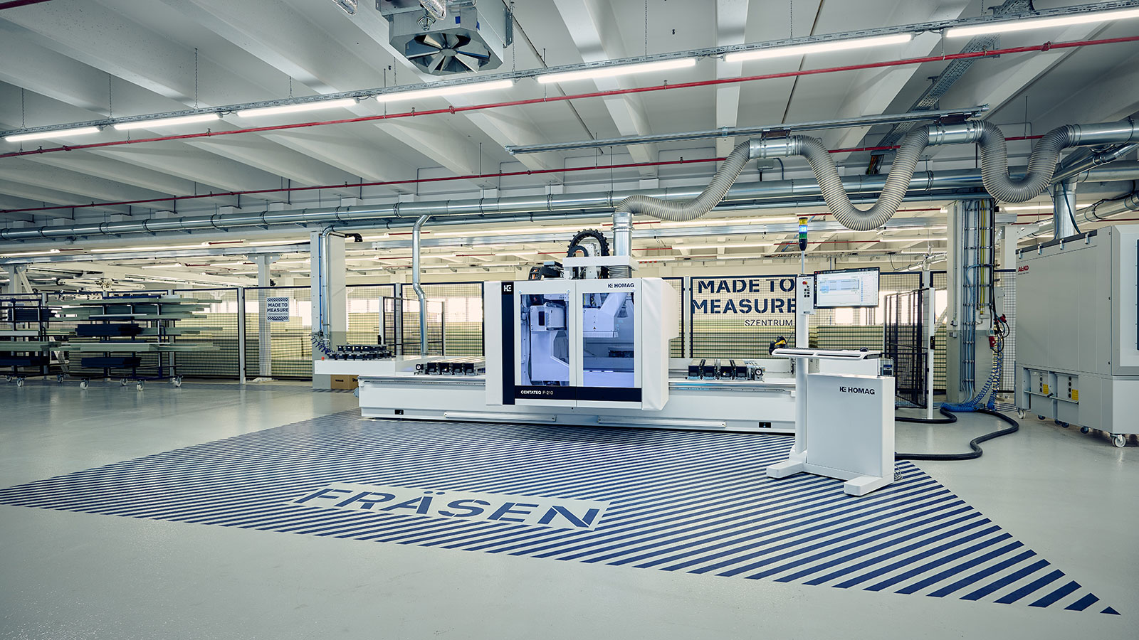 上游的锯机-仓库组合系统进一步提高了 CNC 系统的生产能力并简化了操作。“我们为锯机选装了 Power-Nuten 装置”,Leinert 表示。有了这个装置,锯机可以一次性制作所有必要的沟槽,并且速度惊人。HOMAG 锯机完成一条沟槽只需 5 秒钟。而 CNC 上的这一工作步骤则需要大约 20 秒。“我们因此节约了相当于 CNC 工位上足足四倍的加工时间。”产品经理认可并总结说:“这极大地提高了我们的效率和产量。”