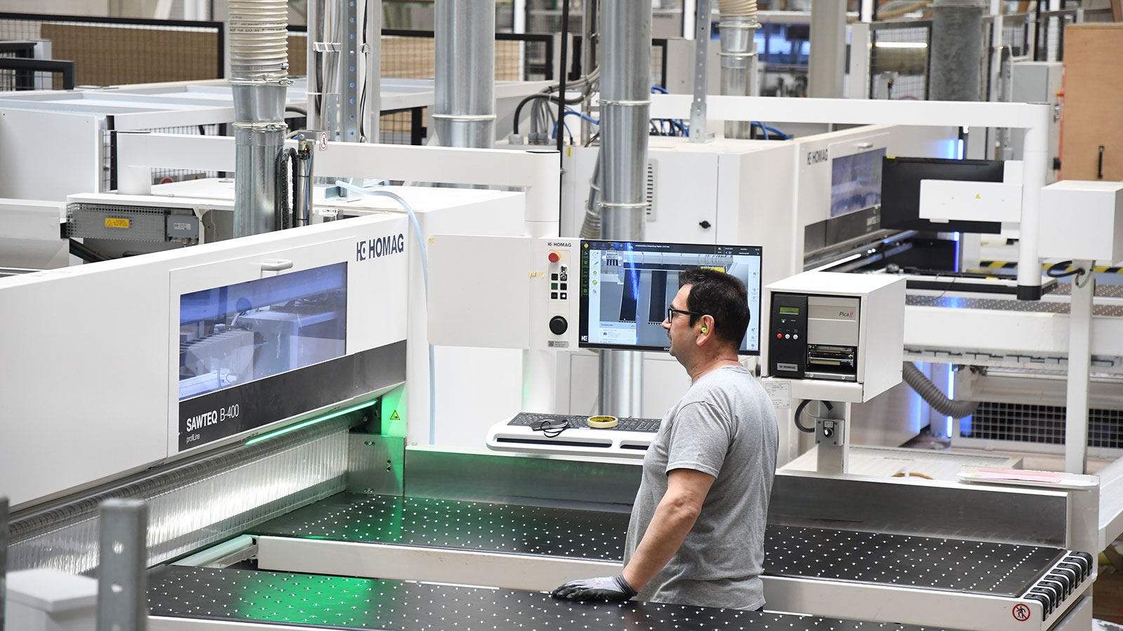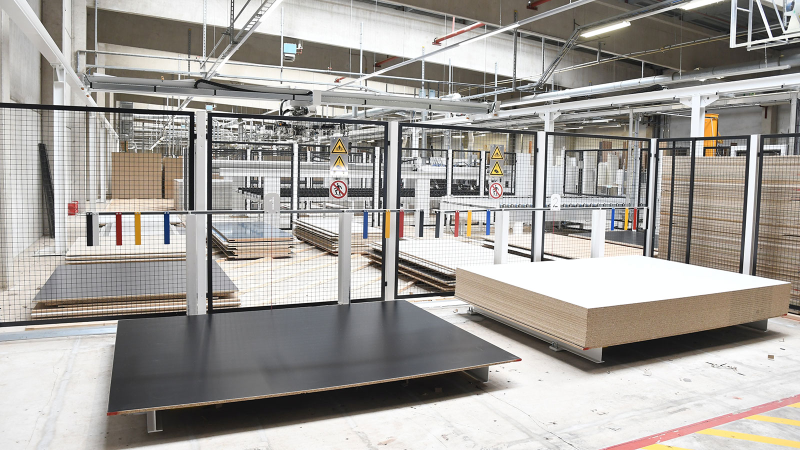 Breitschopf 将列车经过的六个生产区分别命名为因河、多瑙河、德劳河、恩斯河、斯泰尔河和摩尔道河。列车的始发点是因河,那里有一个板材仓库“STORETEQ S-200”以及三台用于锯切的 HOMAG 锯床。可靠同样是其中的关键词。因此这里配置了三台锯床,其中包括一台“SAWTEQ B-400 profiLine”。“原本只需要一台锯床就可以全自动切割每天经过这里的 1,500 个工件。但对我们来说,更重要的是保证列车的运行 — 即使有一台机床发生故障。我们的生产周期很短,并且必须根据拣选单和订单工作,不允许有任何差池。”