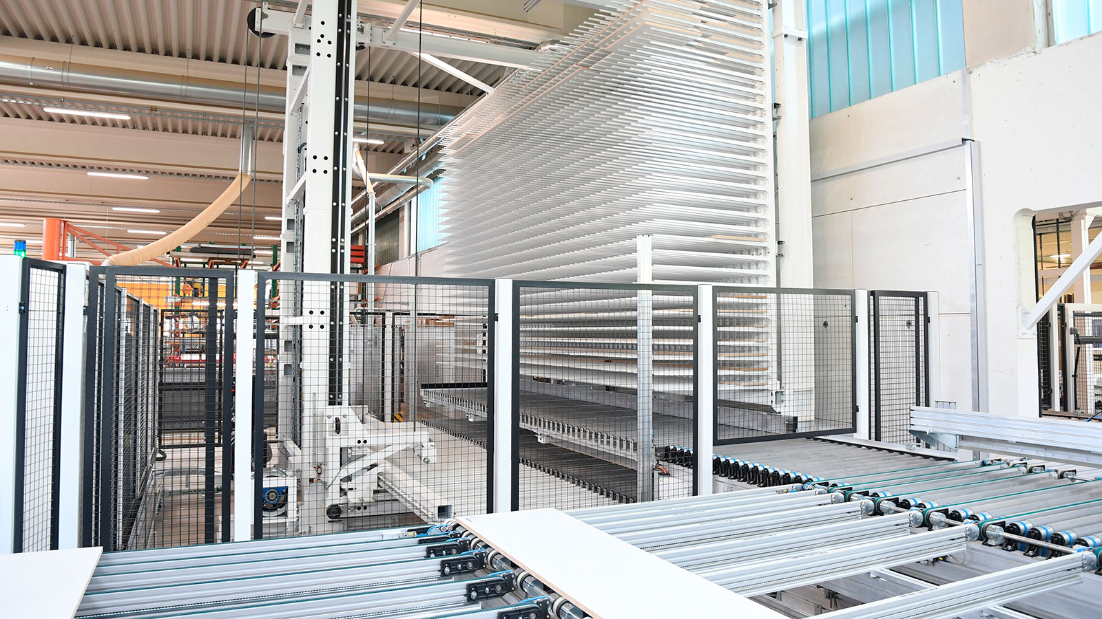 现在的切割工作从板材仓库开始,Alpnach Schränke 将其设计成一个高架仓库。通过条形码检测成捆的板材,然后用叉车放置在辊道上并运送至仓库中。在这里,安装在轨道上的操作设备根据固定规则向悬臂式货架提供板材垛。“例如,我们规定了哪些库位只堆放需求量最大的单一种类板材,哪些库位用于随机堆垛。仓库软件自动控制入库和出库,而订单处理顺序则由生产管理系统决定。其中还包括确定哪些订单需要单独下料,哪些订单要合并裁切。