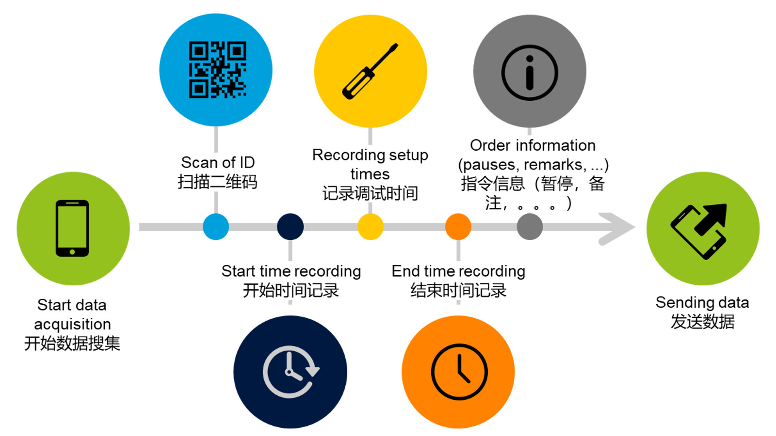 通过使用该app,可以快速配置和使用不同功能模块的工作流。这样,在app中可以设置适用于操作流程的各个功能,并在几分钟内分发到移动设备端。例如,通过条形码或二维码扫描识别部件,并在下一步中进行质量确认。如果质量不合格,接下来就会被记录。全面的质量检测在一次操作中完成,并且完全不受地点限制。这样就实现了一次简单而有效的流程数字化。记录的数据保存在云端。为了对数据做进一步的加工,可提供多种选择。从将数据直接整合到公司内部的ERP中,到在Excel里做简单的可视化和评估。这些可能性与数据搜集的可能性一样多。这只是许多特定应用程序中的一个例子。如下面的实际案例所示,还可以实现更多更复杂的过程。