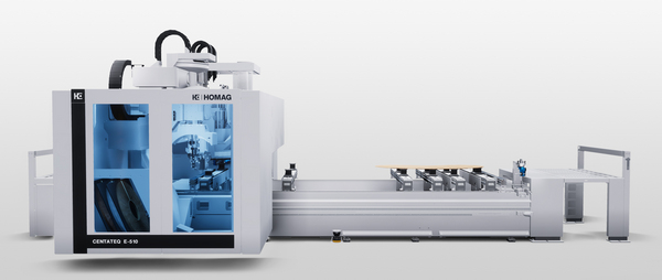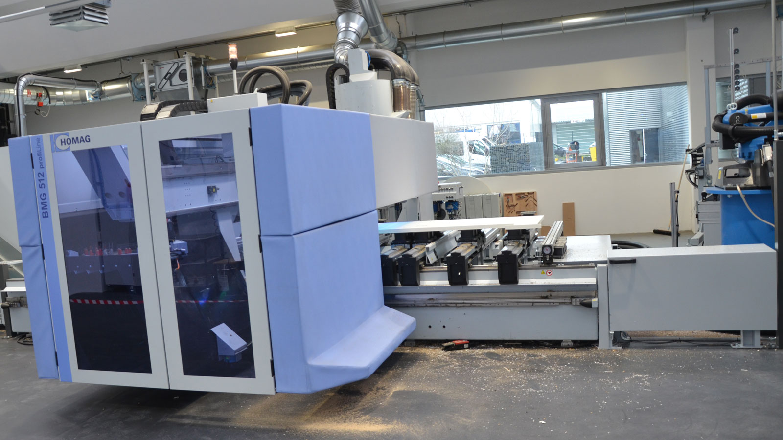 加工中心CENTATEQ P-500 (BMG 512)构成 CNC 单元的核心,该加工中心为模块化构造,并且可以根据客户意愿和要求进行配置。Erfi 的生产负责人要求其BMG必须有高度的灵活性。因此选择 5 轴主轴Drive-5C+作为铣削主轴。托架式工作台的托架配有高精密直线导轨和具有两个气动缸的辅助上料装置,能够方便搬运,钻孔单元“Multi-Processing-Unit”可以回转 360 度,使得所有主轴可以在任何角度使用,这些均着重强调了加工中心的灵活性。这也适用于链式换刀器,该换刀器共有 72 个刀位,换刀时间很短,是灵活使用大量刀具和加工单元的基础。要求直边以及弧形边都必须有相同的质量,因此也选择了laserTec系统对成型件进行封边。由于这里的加工时间明显较长,因此将裁片搬运工作交给 5 轴工业机器人。操作工可以同时在另一处工作。