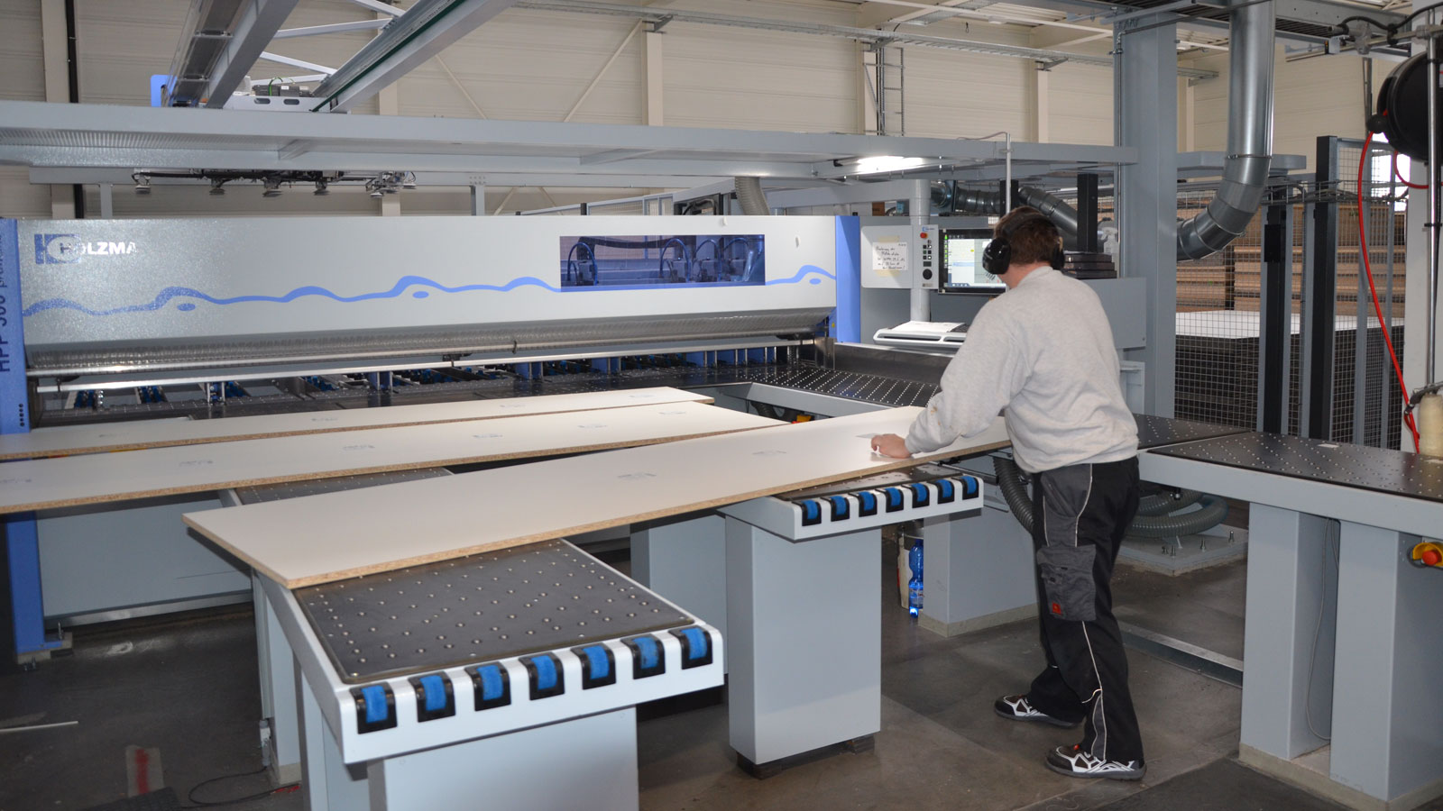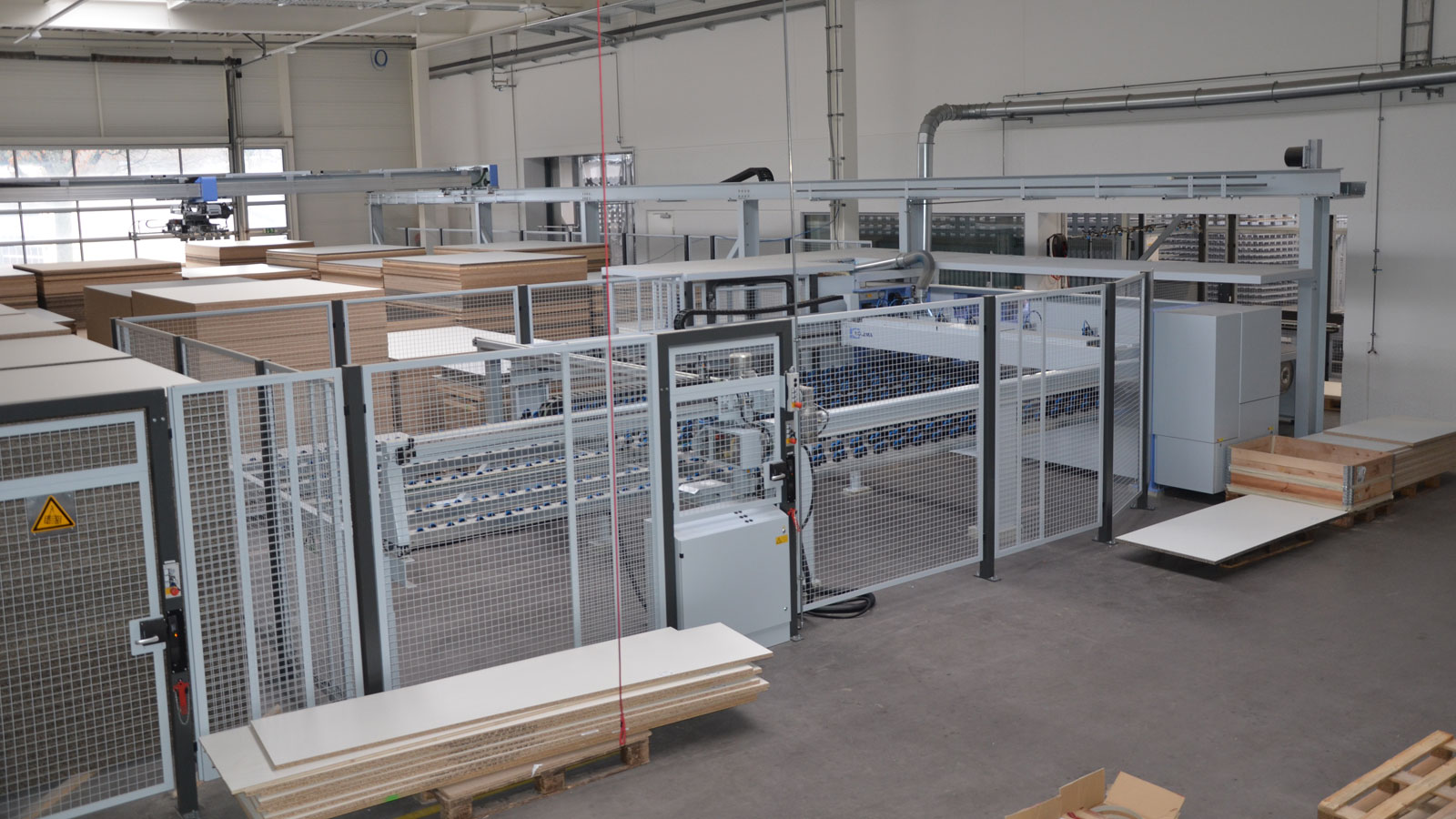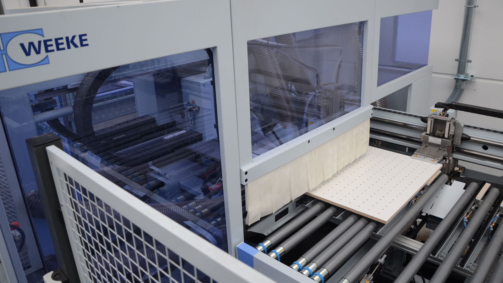 可以将互联系统的机器完美安置在现有的车间中。参观者可从自动化裁片流看出这是高度自动化的生产。在生产线的起点,裁板锯SAWTEQ B-300 (HPP 300 profiLine)及其前置的平面仓储系统STORETEQ S-500 (TLF 411)完成板材开料。裁板锯具有 95 mm 锯片露出高度,不仅可以分割单张板材,而且也可以分割板垛。因此也能以经济方式裁切较大数量的板材。其它选项能起到提高生产率或者保护材料的作用。平面贴标机在裁板锯前面给坯板贴标 — 这样能进一步加快开料速度。每个裁片都从标签打印机获得条形码标签,从开料直至装配的全过程中可以凭借该标签识别裁片。在开料与封边之间首先将裁片放在分拣缓冲区SORTEQ R-200 (TLB 321)中,该缓冲区能容纳 1200 个不同大小的裁片。