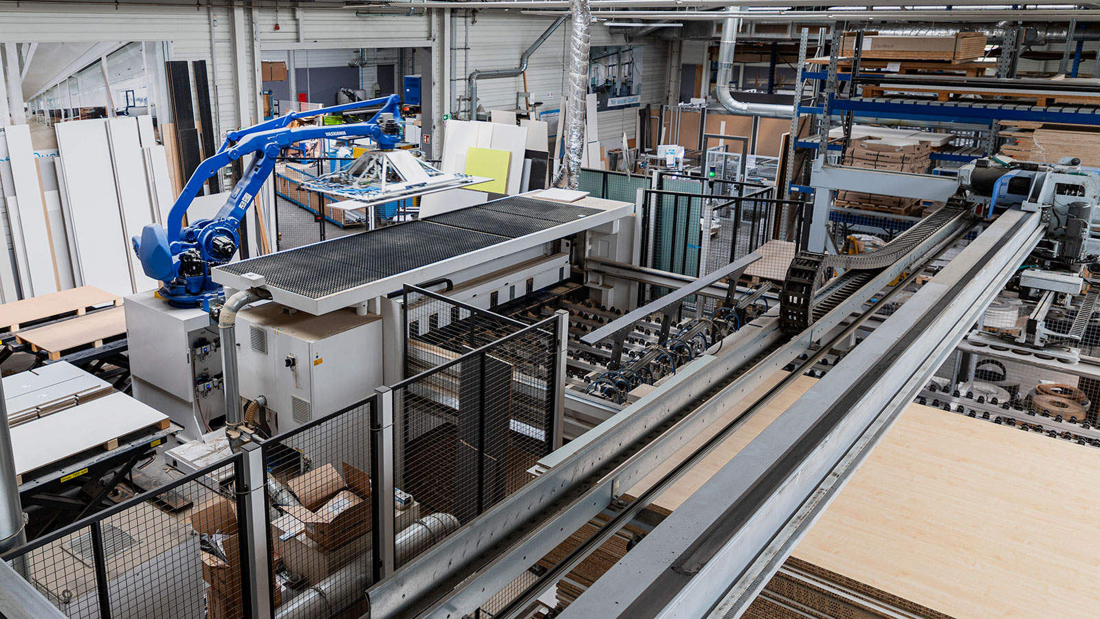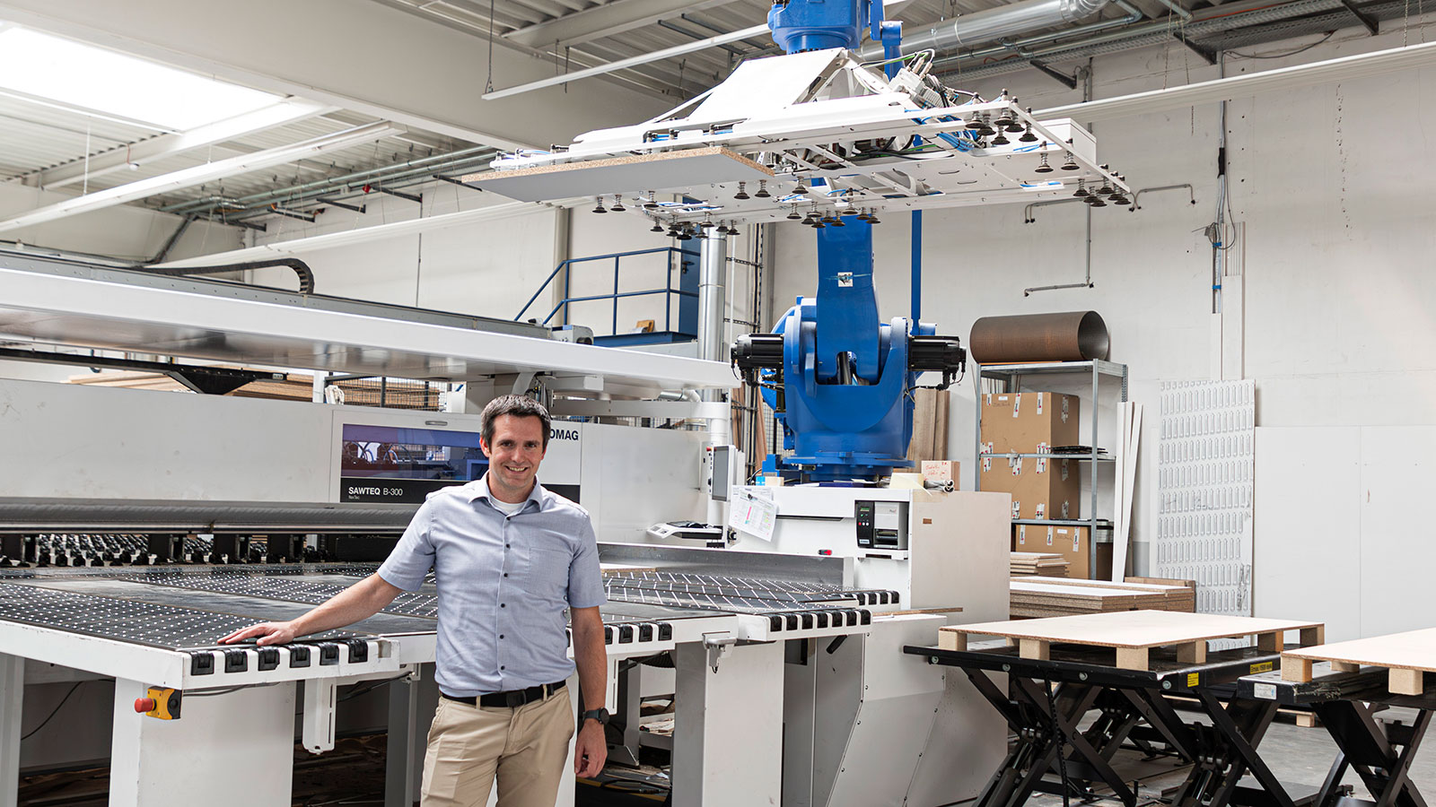 2019 年,质的飞跃:裁板锯 SAWTEQ S-300 flexTec 与仓库 STORETEQ P-500 的组合开始投入使用。这款用于全自动切割的高性能裁板锯专为机器人支持的自动运行而设计,但也可以像往常一样进行手动操作。“S-300 flexTec 让我们的自动化程度达到了 85%,这个数字还可以再提高,但作为基础已经无可挑剔。”Armbruster 笑着说。“采用机器人模式时,SAWTEQ 甚至可以在员工下班后继续工作三小时......”