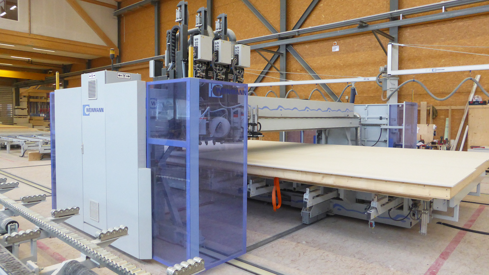 The quantities in modular construction alone make it understandable that in 2013, the Swiss company invested in new facilities and a highly automated production line. If we extrapolate the entire production volume based on the data for modular construction, there is no alternative to industrial production: on this basis, 7500 to 9000 elements pass through the production line in Gossau each year. In line with its focus, the company equipped the new facilities with a production system for timber frame elements. As the company already had a sizeable workload, the management team was not primarily interested in increasing quantities - it was more interested in achieving a consistently high level of quality and a clearly structured production sequence. The latter also benefits the quality, as a well-planned, clearly structured production process also increases the efficiency of quality management. The company also wanted to modernize its production in terms of employee satisfaction, as production was previously manual and took place in a tight space. In parallel to the new installation in production, the company made the individual modules and elements more uniform. According to General Manager Richard Jussel, "Automated production is not the sole answer to making production faster. To utilize potential to the full extent, a company also has to optimize its processes and products." This includes well-planned material logistics for the production line: the hall layout designed by WEINMANN therefore placed great importance on short routes between the material depots and work tables, fast and ergonomic handling systems, and providing sufficient space for transporting material in and out without any problems.