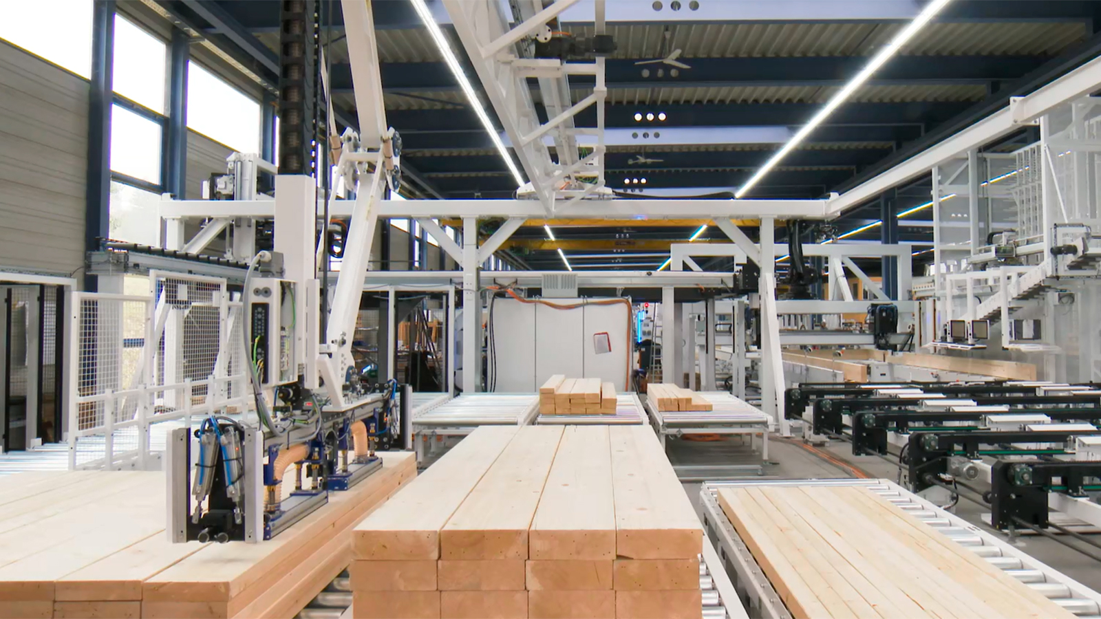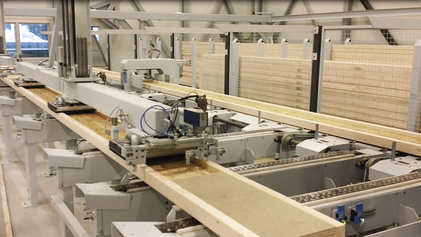 The STORETEQ H-700 enables you to feed the carpentry machine with beams of different lengths. The portal takes the raw material directly from the material stack and stores it in the upright position. From here, the required wood is automatically transported to the carpentry machine. The result: An efficient and flexible material and production flow.