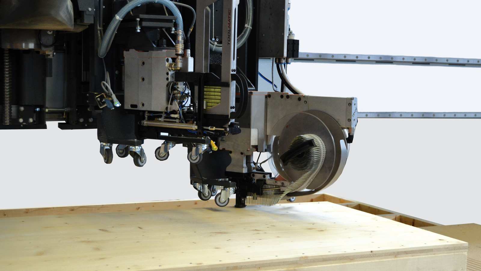 Maximum productivity: The sheathing can be secured in parallel with the two fastening units. Optional: Fully automatic positioning and attachment of slats and shuttering boards on one layer.