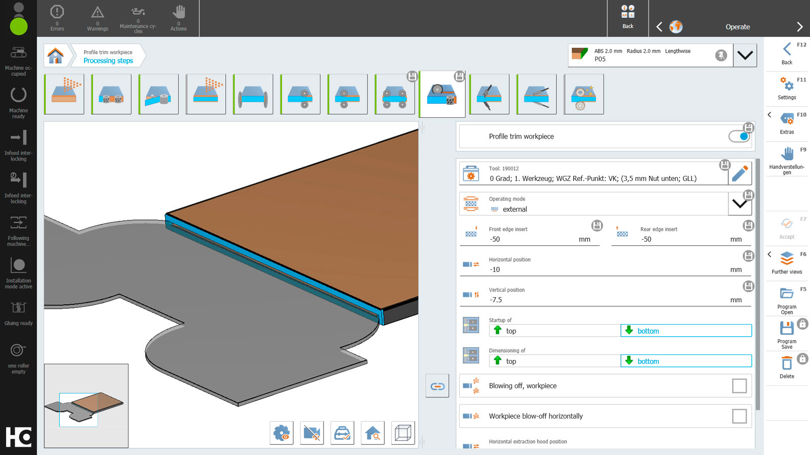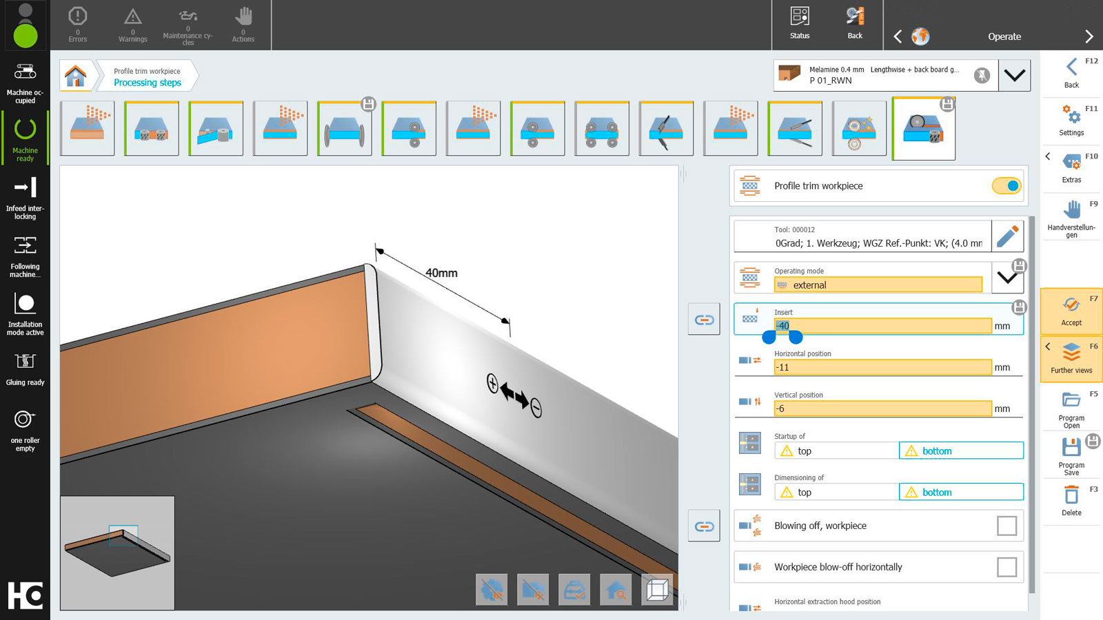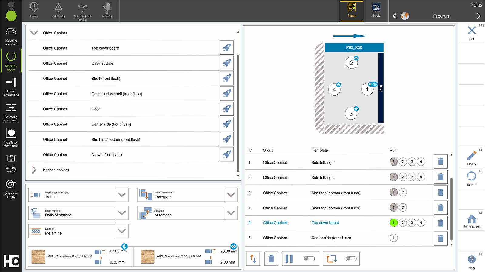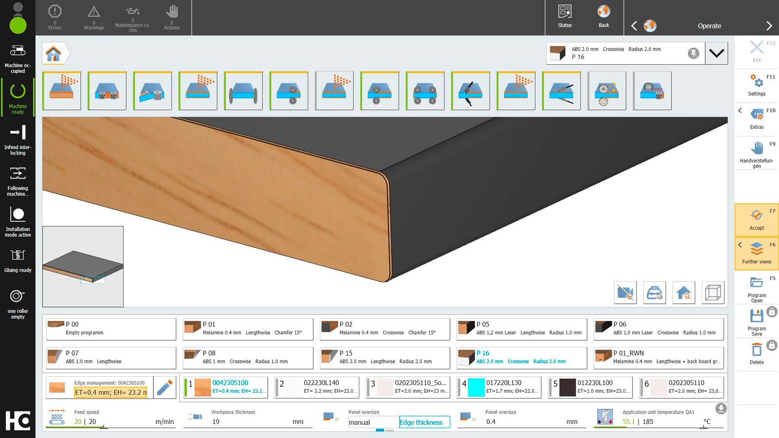 Software for quick selection of the processing programs and the edge material. For the reliable and fast acquisition of production parameters as well as the workpiece-oriented creation of machine programs. The new operating platform makes it easier to handle complex machines thanks to consistent digitalization and simplified operation, a reduced number of clicks due to program linking and improved operator guidance.