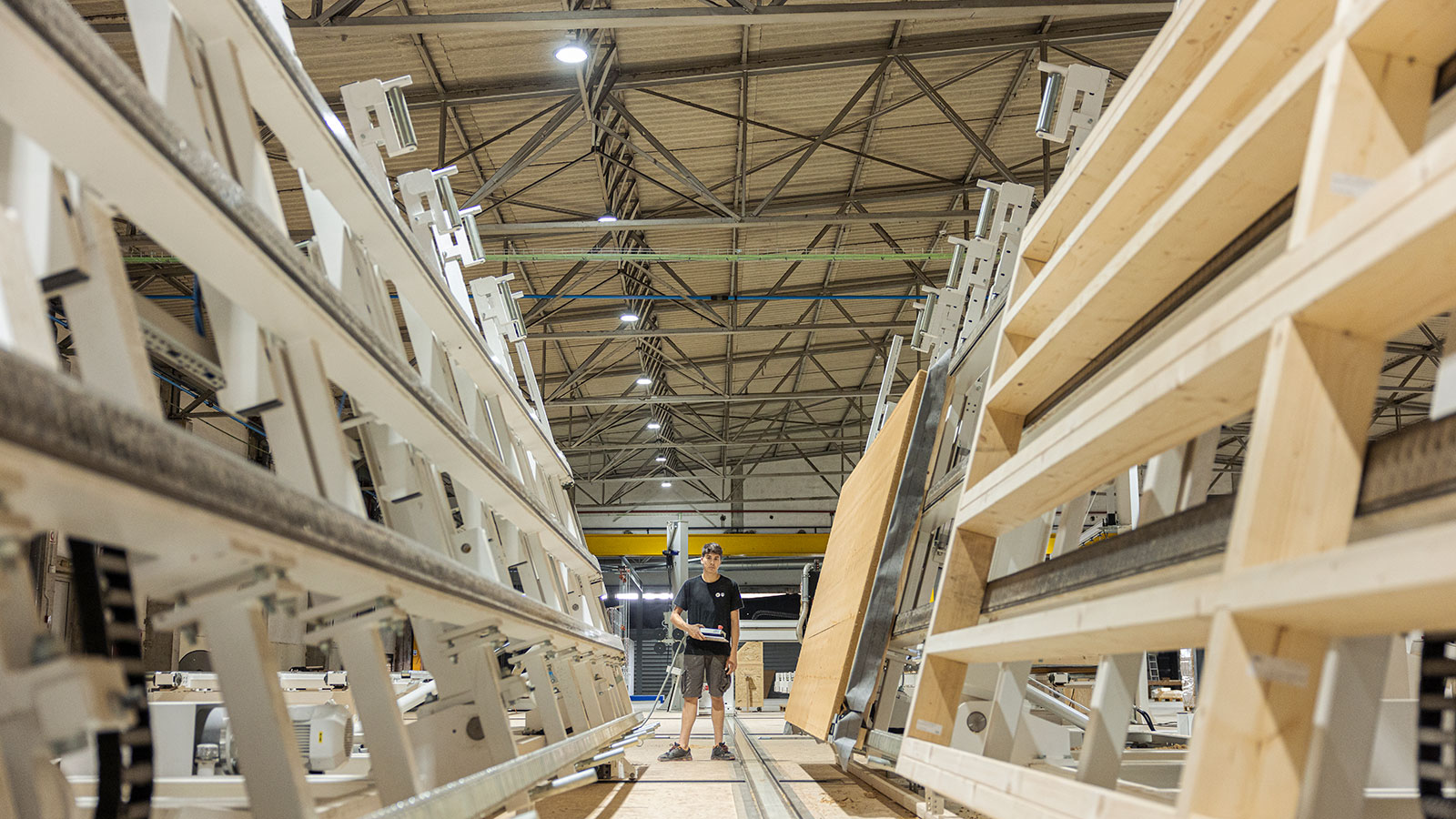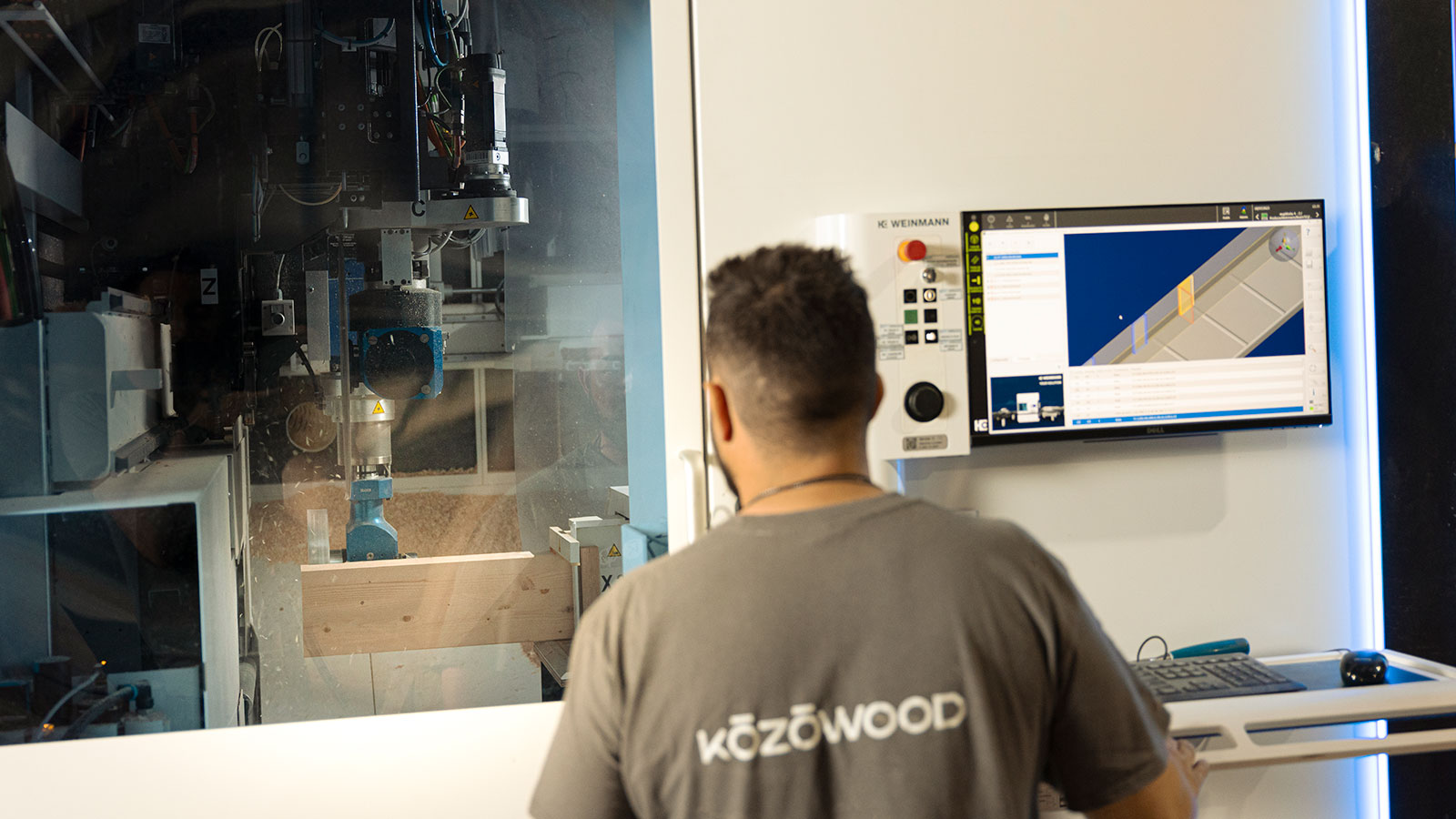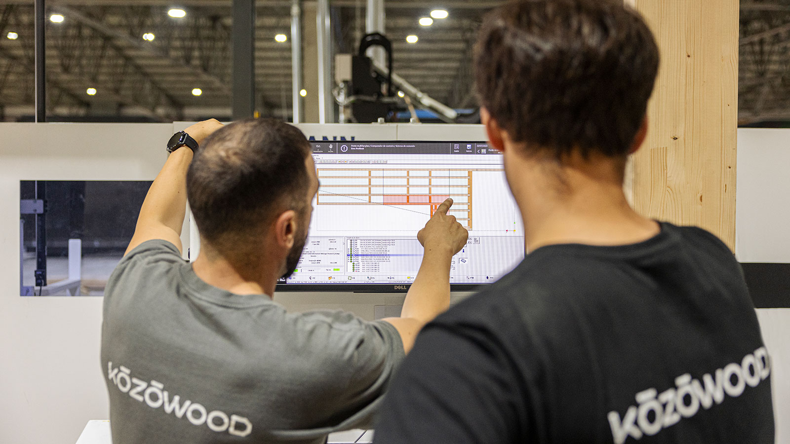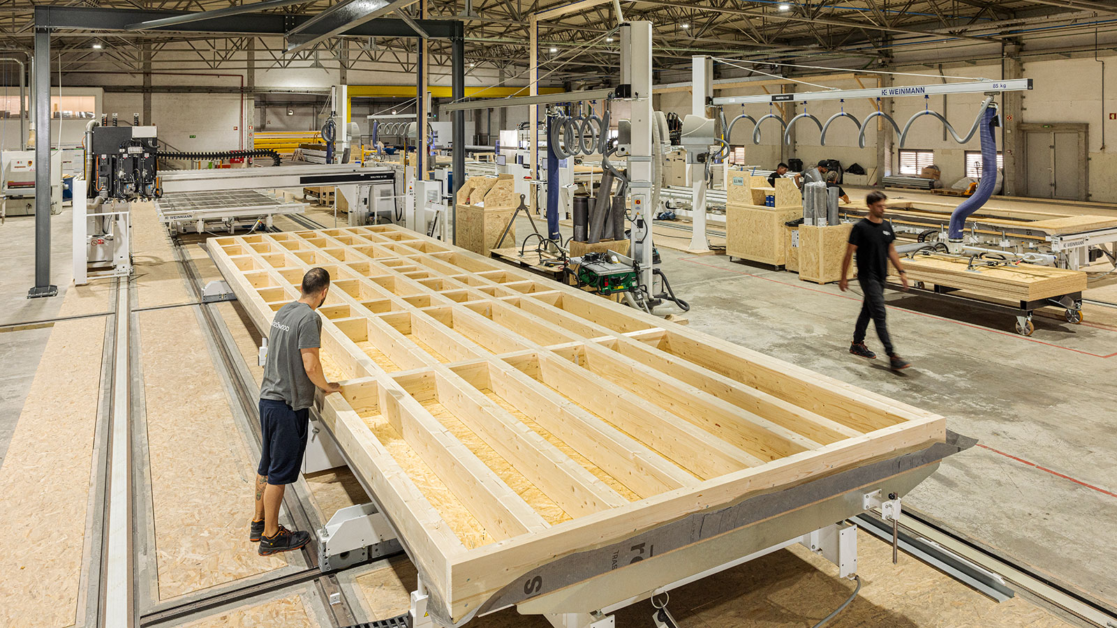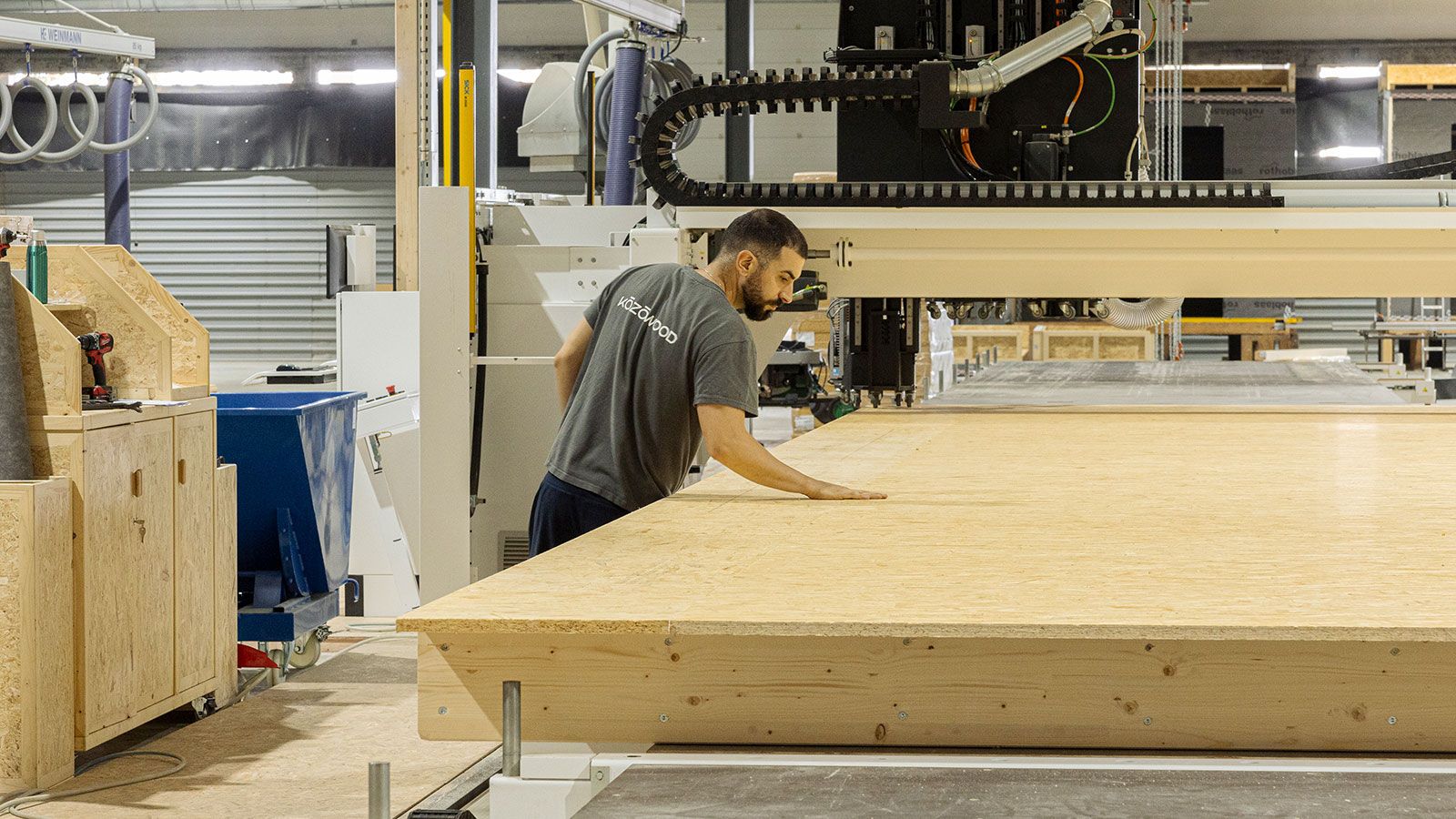 In order to expand production, Kōzōwood invested in the expansion of its two core areas: The production of timber frame elements and cross-laminated timber (CLT). This laid the foundation for further company growth in the long-term. Early on in its history, the company began using a WEINMANN production line for the prefabrication of timber construction elements. The production line was put into operation at the end of 2022 and now enables the company to manufacture 250 to 300 houses per year. To expand production further, the company also purchased a CLT line from System TM and Kallesoe, companies which are also part of the HOMAG Group. The production lines used by Kōzōwood enable the company to achieve a level of efficiency, quality and customer focus that is unrivaled in Southern Europe. To reduce the negative impact of the shortage of skilled workers, the company has also invested in internal training and international consulting services, which encompass employees in both the production and assembly departments. Kōzōwood currently employs around 100 people and plans to increase this figure by an additional 150 in the near future. By 2025, the company aims to be producing three houses per day, thus making its mark on both the national and international markets. To achieve this ambitious goal, investing in the right technology is key: Element production with WEINMANN machines begins with cutting and processing beams using the BEAMTEQ carpentry machine. The finished beams are then transported to the wall line or the roof and ceiling line. In the next step, the beams for wall production are precisely positioned on the BUILDTEQ assembly tables and connected. Using vacuum lifters, the sheathing materials are ergonomically positioned on the frame works and then secured using a WALLTEQ multifunction bridge. Next, the elements are turned automatically to start the blow-in process for insulation materials such as cellulose or wood fiber. This process is CNC-controlled by the WALLTEQ M-300. The insulated elements are then sheathed and secured. The components are transported onward to a wall slot, where additional tasks such as window installation or facade processing are carried out. In keeping with Kōzōwood's motto, the production of closed and insulated elements promotes the sustainability and ecology of timber construction and simultaneously meets the high level of demand for long-lasting insulation and sound insulation. The technology used in the production lines enables Kōzōwood to build custom houses quickly and efficiently, while achieving an extraordinary level of ergonomics and productivity for its employees. In addition, prefabricating the elements in the factory drastically reduces the construction time required at the construction site.