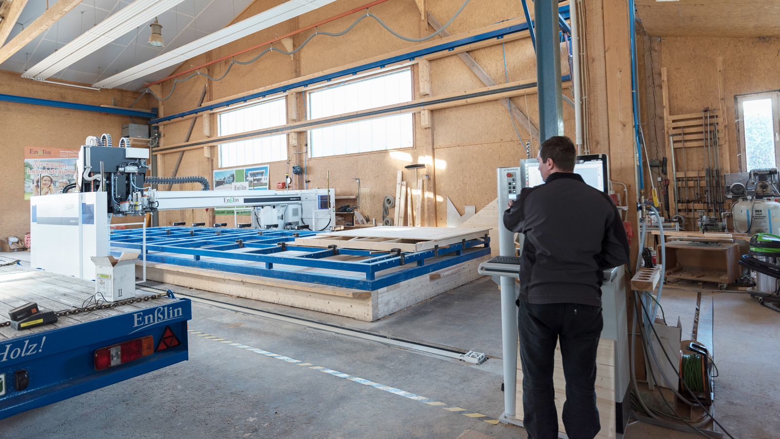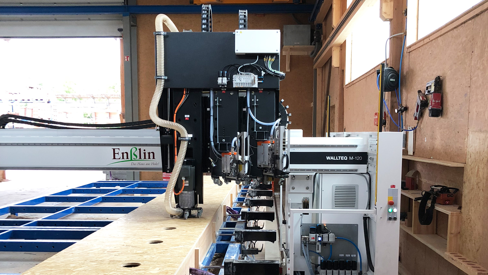 Enßlin: It's something we've been thinking about for a long time because it's becoming increasingly difficult to find staff. However, the machines that have been available so far have been over our budget. But because we were increasingly struggling to meet the rising level of orders with the existing personnel, the issue still remained. In 2017, we attended WEINMANN Treff in St. Johann, where we came across the brand-new WALLTEQ M-120 multifunction bridge. As an entry-level solution in CNC manufacturing, it's designed for timber work companies of our size and it can be used profitably in the production of wall, roof, ceiling and gable elements for even small quantities. Added to that are the small space requirements, high level of precision from modern CNC technology and production in batch size 1 - all with an acceptable investment cost.