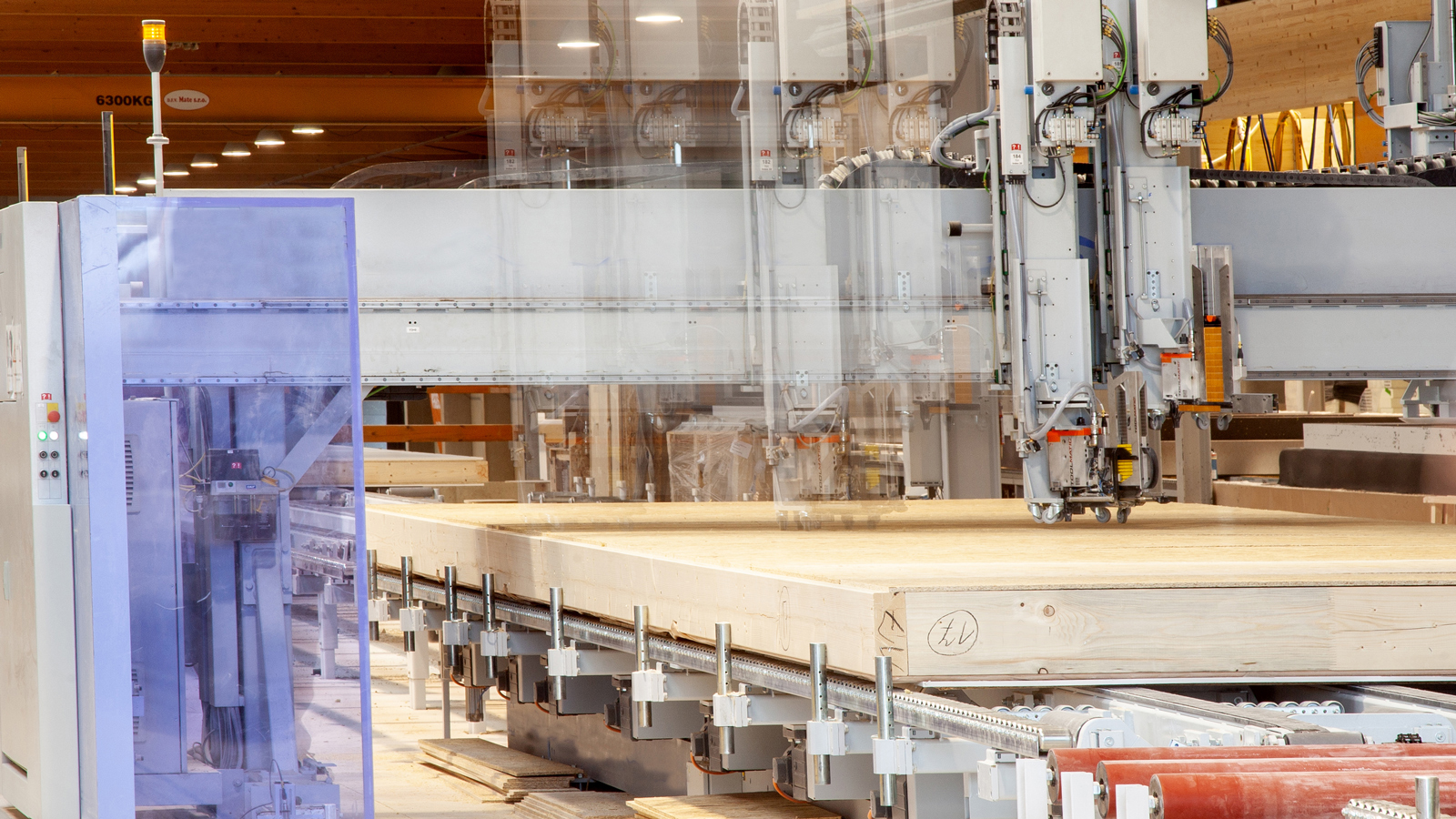 From there, there is a good overview of the company's new production line: a WEINMANN BEAMTEQ B-560 beam processing machine with fully automated feed, a FRAMETEQ F-700 frame work station and finally a WALLTEQ M-380 multifunction bridge with two work tables. On these tables, the first sheathing layer of the elements is attached using vacuum panel lifters and processed fully automatically.