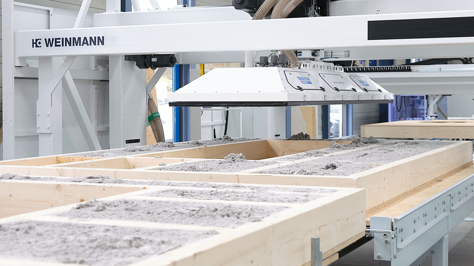 In view of this good business development, Daniel Hamdorf considered upgrading his firm's timber frame production facilities again in 2020. After consulting his employees in work preparation and production, he initially thought about automating the insulation process: "That was the first step. There was also a desire to further optimize the production processes. Our aim was to reduce the permanent two-shift operation that we had been using for three or four years back down to one shift – with the same or perhaps even higher output." With this concept in mind, Daniel entered into discussions with WEINMANN and developed a tailormade production line in consultation with project manager Jörg Groß. It consists of five work tables that – unlike in the previous version – all have multifunction bridges running over the top of them. Two of these bridges are new: A WEINMANN WALLTEQ M-310 insuFill reduces the working time in preparation and production by a good 80 percent by blowing in insulat-ing materials completely automatically, claims Daniel, while a WALLTEQ M-120 processes the sheathing at the front two work tables. Having been given new software for this purpose, the multifunction bridge of the former three-table system now does its job on the two rear tables. The existing work tables have likewise been modernized to a large extent. For example, they have been equipped with longitudinal transport systems that enable central control of the workflow in the long term (see below). The two oldest work tables have been replaced by new acquisitions but are still put to good use today in a separate floor element production line. Daniel was particularly impressed with "how seamlessly the existing production units were able to be integrated into the new line. I hadn't expected the current software to run on our aging bridge. With both this and the tables, it became abundantly clear that the modular expansion potential offered by WEINMANN machines wasn't just an empty advertising promise." The system's peripherals have been refined in order to optimize the flow of materials around the production environment too. With the exception of the insulation station, each table is now operated by a panel lifter, enabling material to be placed on four stations close by and processed by a multifunction bridge. This can be done at the same time for both the interior and exterior planking and alternately at the two assigned tables – with no long down-times for the bridge. This ability to perform several operations in parallel, combined with the greatly reduced processing times at the insulation station, explains the significantly higher output of the new line.