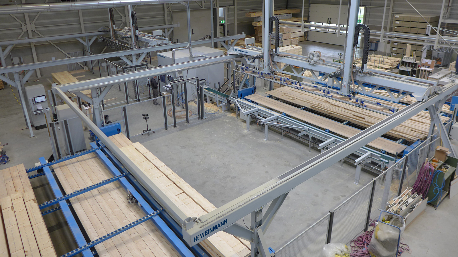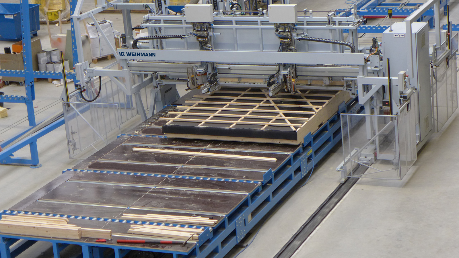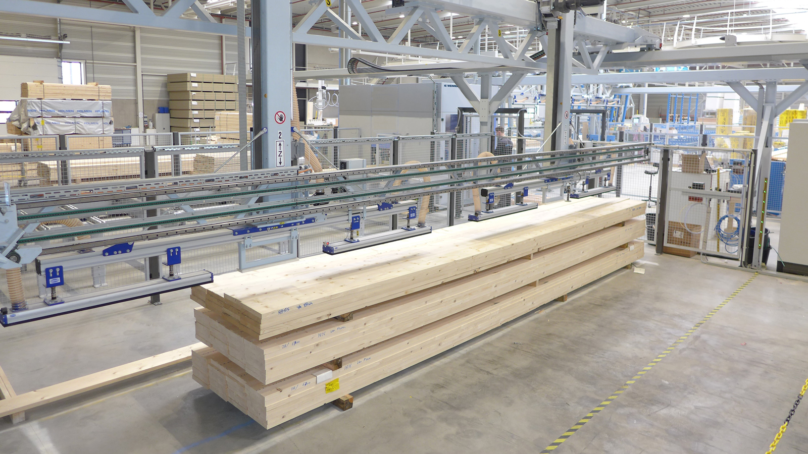 Flier: The beams to be processed are automatically taken from the stack of raw material by the feeding portal and then fed to the carpentry machine. After cutting and beam processing, the processed timbers are discharged fully automatically, collected and destacked according to element type. From there, the timbers are transported via a buffer line directly to the two production lines. To ensure that the lines are supplied with the appropriate components in the correct order, the production control system for the carpentry machine generates two job lists with the data records for each line. The buffer function is independently monitored and regulated by the BEAMTEQ B-560. The destacking portal, which operates the buffer, is fitted with a vacuum suction system that can pick up small parts even down to 300 mm in size. We worked with WEINMANN to develop this stacking technology - the first of its kind in the industry. This was a decisive purchasing criterion for us.