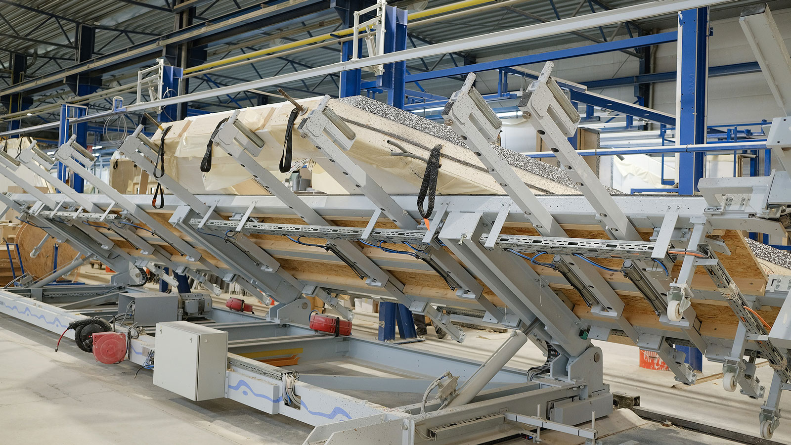 The line – two BEAMTEQ B-560 carpentry machines with working lengths of 6 m and 13 m, one WEINMANN three-table solution with one WALLTEQ M-340 multifunction bridge and two turning tables, as well as six buffer positions – can also produce standard elements, of course, although it is used primarily for angled elements and elements with excessive heights. "The line produces the entire Zenker range, as well as all Elk gables and dormers, basically all of the angled elements." For the standard elements, the company has a larger main line, but this is less flexible due to the serial production. Changing the wall construction on the WEINMANN line requires a lot less effort, says Schandl: "We took the trouble of optimizing all the process steps previously performed manually by employees, thereby reducing cycle times. For example, the cycle times for hemp insulation or an intermediate plaster layer differ significantly from normal wall construction in series production. This is where we were able to get the most benefit. Flexibility was very important for the German market in particular. In Germany, above-average wall heights have become a trend — strictly speaking, no two houses look the same," says Schandl. "In principle, with this system we can produce walls up to a height of 4.5 m. However, from a transport perspective it's a different story — the limit for transport is 3.05 m. Anything beyond that requires special transport."
