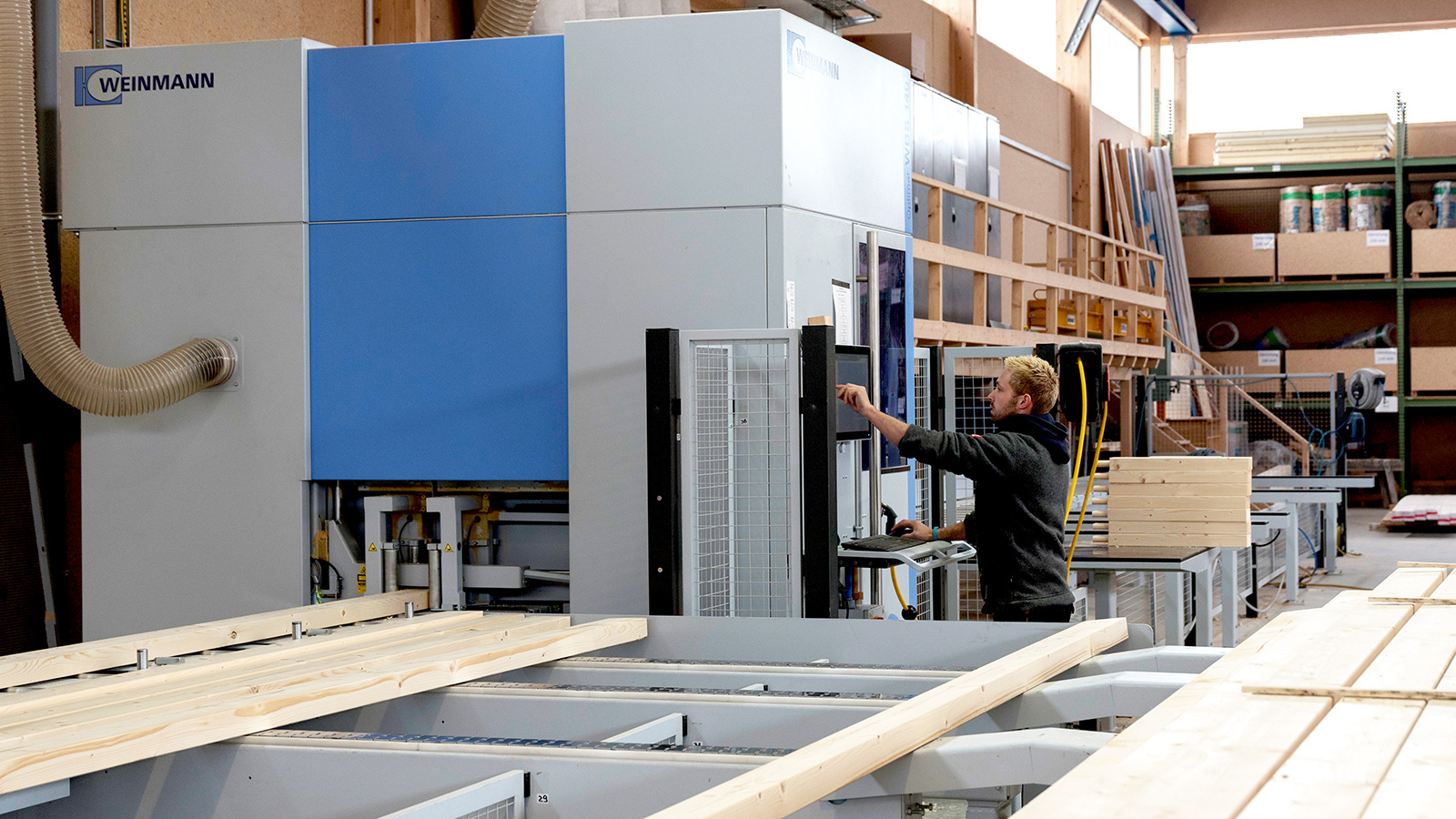 The master carpenter Christian Kienle is all too familiar with the question "where do you build your houses?" He used to hear it a lot from potential customers — in the early days of Kienle Holz- & Ausbau, when carpenter's workshop was still nothing more than a stable and a shed on the family farm. "It worked well for the first five or six years," the carpenter reminisces. "But then demand grew, the road link was terrible, and we experienced problems with receiving supplies and making deliveries. We could have added another building, but then that would have been it. We would have stayed a carpentry and then closed. "Even back then, Christian Kienle saw the future of his company in turnkey timber house construction. Therefore, in 2015, he put his money where his mouth was and moved his company to an industrial area on the outskirts of Neresheim-Elchingen. The new, self-built company building was not the only investment. He installed a Weinmann VarioTec flat-pack table and a WBS 140 beam processing machine in the hall. It undertakes practically all of the beam processing tasks within the company, which currently has a team of 12 employees.