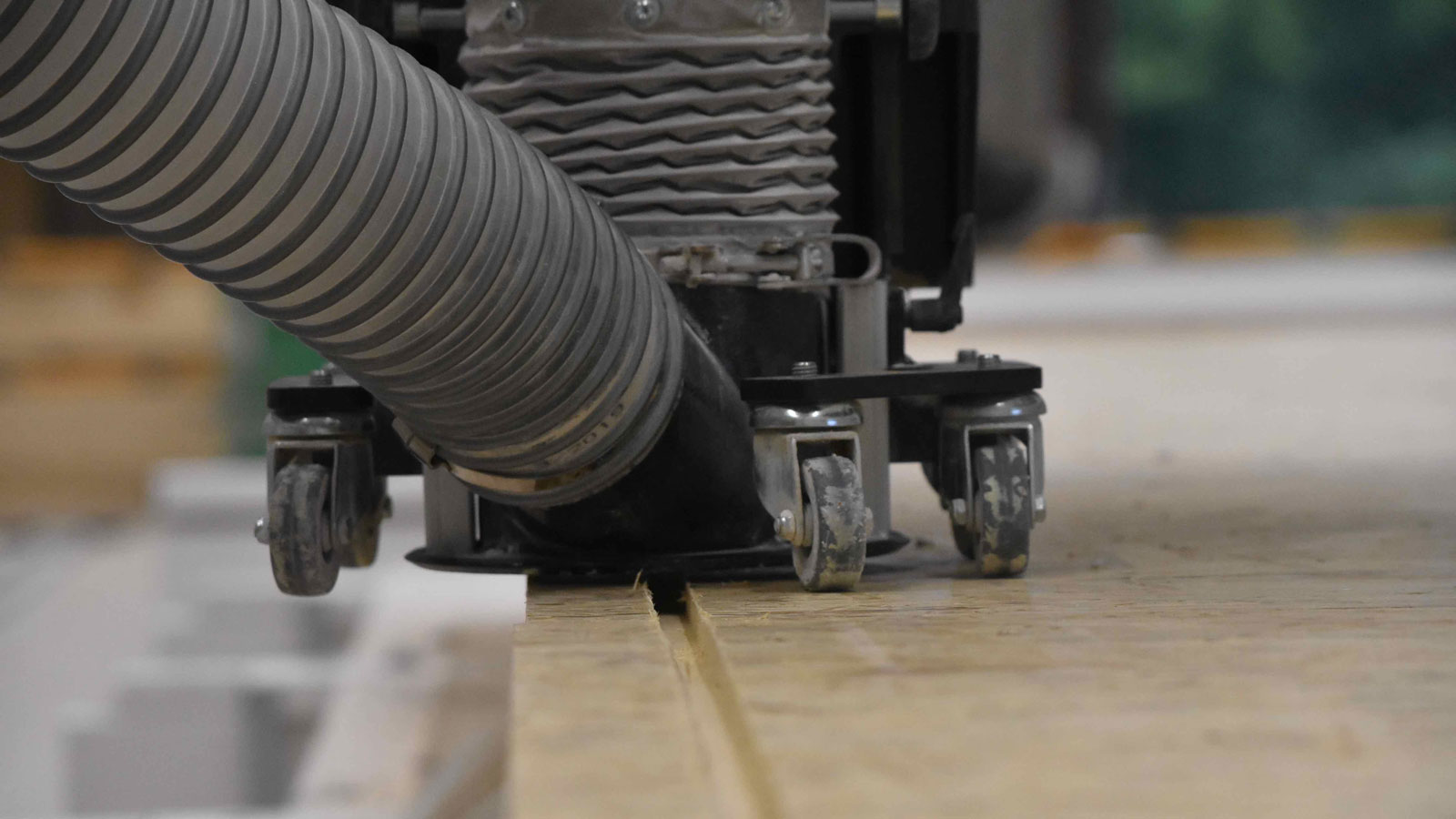 LB Holzbau has seen continual growth in recent years: the number of employees has continued to rise regularly and in 2019/20, a new production hall and a new office building were built on the company's site. It gradually became apparent that in Borken, manual production was reaching its capacity limit. The options were to either stand still or to invest. The fact that the master carpenter decided to do the latter was also down to the fact that the company succession was already secure: "My son, who is currently training to be a master craftsman in Kassel, will take over my company in the long term. Our investment in automated production was thus an investment in his future." The market launch of the WALLTEQ M-120 multifunction bridge played an important role in this decision. This multifunction bridge, specially tailored to the needs of small timber construction companies, "was a perfect fit for the size of our company," remembers Ludwig Böggering. "The investment was also affordable, especially as the multifunction bridge can be combined with flat-pack tables. We used this option." The insulation is inserted into the cavities of the elements with a manual Isocell blow-in plate. The company has been outsourcing beam processing for years: "We can get this done to such a high quality and at such a good price that it's not worth investing in a beam processing machine ourselves."