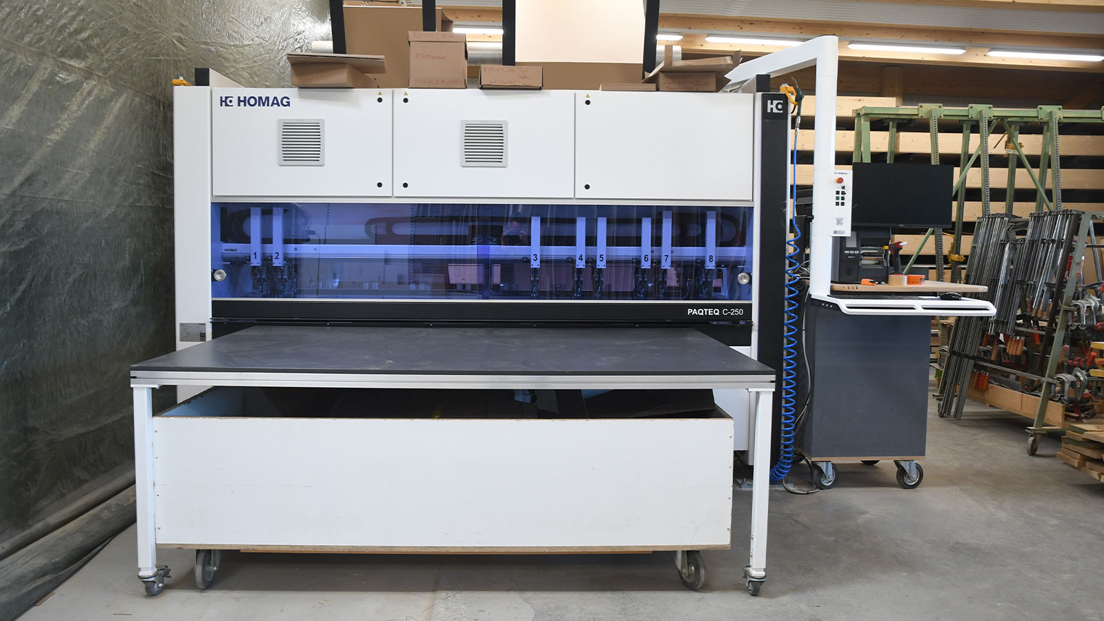 When selecting a suitable cardboard cutting machine, for the men from Riegersburg, a PAQTEQ C-250 from HOMAG was essential. In its standard version alone, it was already able to meet the requirements of the carpentry company. "With a circular blade assembly of eight units, we have the maximum amount of equipment — and therefore achieve the highest degree of flexibility." Cardboard is fed endlessly via a one-way changing system that can be loaded with different formats. "We currently use widths of 0.9 m, 1.40 m and 1.50 m, and one of these widths will probably become the main reference in the future." While the PAQTEQ including the control system is a standard model, a system already used by Radaschitz was to be used for data provision. From the very beginning, the numerous items of process and component information available were to be transferred to the machine to be used there. To ensure this, HOMAG linked the ERP software of the carpentry company to the standard output. "The basic idea has always been: I need made-to-measure items for single parts as well as complete furniture. This was ultimately implemented very well," says the owner. Today, the processes are so networked that packaging can be controlled from work preparation. The barcode, which is issued at the beginning of the production process, defines the respective preferred packaging. On the PAQTEQ, the data record is then called up from the system by the barcode scanner. In addition to the length, width and height of the component-specific or cabinet-specific packaging, reference cardboard box types are also defined. "We wanted to use the data already available for these preferred cardboard boxes," Radaschitz emphasizes again. "Today, this works just as well for single parts as it does for cabinets." Starting from this basis, he can imagine further optimizations "in which data is delivered to us after scanning right up to dispatch."