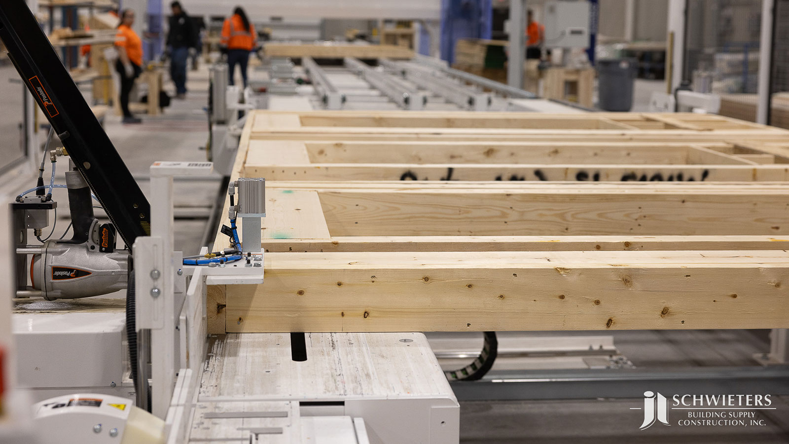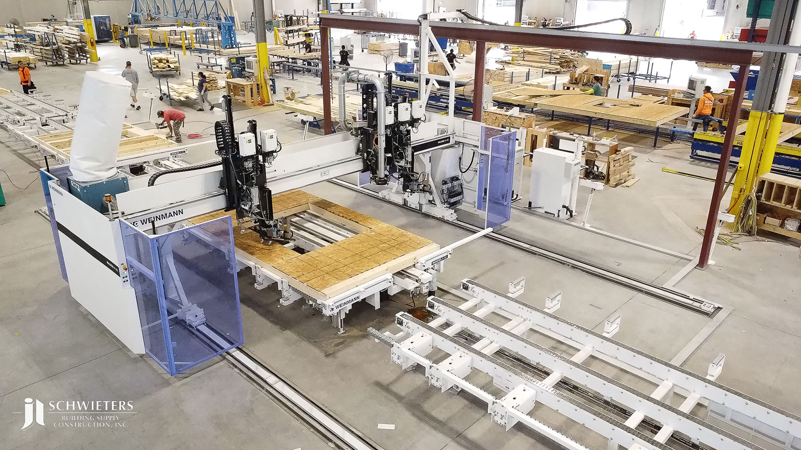 Casey Harless, National Sales Manager for Off-Site Construction from STILES Machinery recently had the opportunity to sit down with Blake Schwieters from JL SCHWIETERS CONSTRUCTION to review their off-site construction process. As the Plant Manager of SCHWIETERS in Hugo, Minnesota, Blake oversees all prefab operations. His responsibilities include overseeing the team, ensuring safety compliance, managing project details, and keeping costs within budget. Blake plays a critical role in implementing continuous improvement strategies, including their new truss division. The new WEINMANN line purchased by JL SCHWIETERS is designed to maximize the efficiency and ergonomics of the employees. Allowing for JL SCHWIETERS to produce a superior product quickly and accurately. Framing of walls starts on the WEINMANN framing station FRAMETEQ F-500. This machine enables automated framing with highly accurate indexing, cutting, and nailing and is operated by just one employee. After that the wall panel is automatically moved to a powered buffer table BUILDTEQ A-500 which allows to add blockings to the wall panel and offers some buffer space between the framing station and further process steps. Tacking of the sheathing for exterior wall panels is done on another BUILDTEQ A-500, with additional clamping units to secure squareness of the element. With the multi-function bridge WALLTEQ M-500 the wall panel will be finally processed. That includes automated nailing and routing of rough openings, like window and door openings. Due to high quality requirements of JL SCHWIETERS the wall panel is clamped on another BUILDTEQ A-500 WEINMANN table with a stud straightener to avoid shiners, when nailing the sheathing. This additional support allows the customer to produce high quality products and reduce rework at the end of the line. The final BUILDTEQ A-500 WEINMANN table is used as an off-load table, to stack the wall panels and do the final quality inspection.