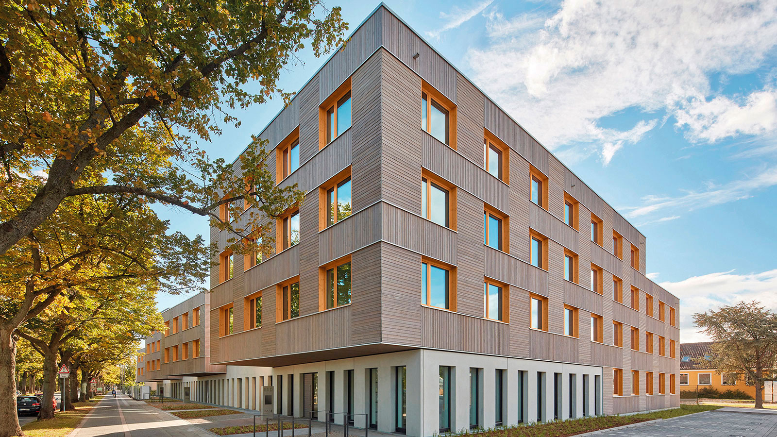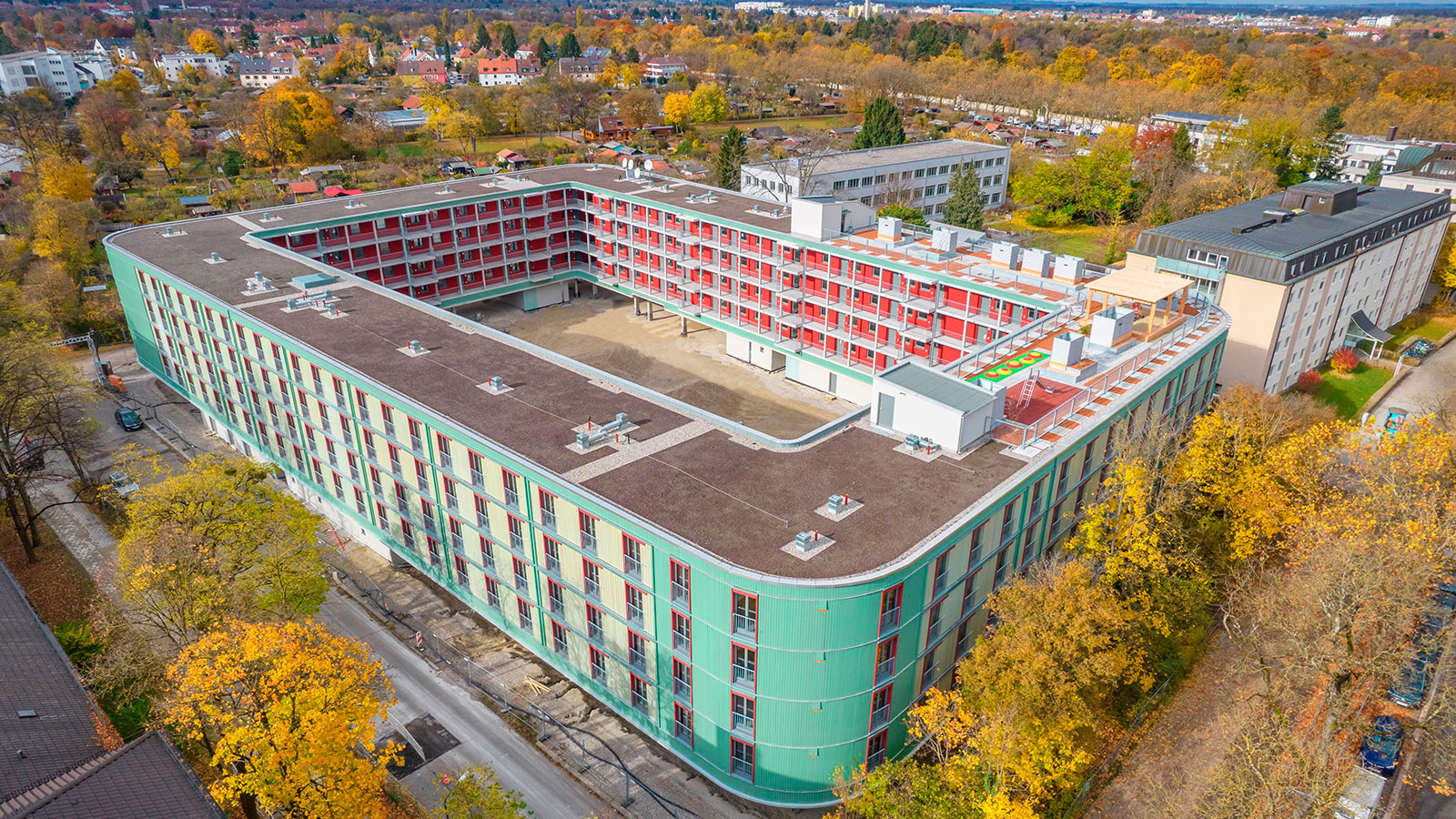 The Dantebad II apartment building in Munich has been completed as of January 2022, following a construction period of just 15 months. The five-story building with four residential floors features a wooden hybrid construction and houses 144 apartments over 8200 m². The four wooden floors were constructed from prefabricated surface elements over a working period of 18 weeks. The key principle of this project was to construct housing on an existing site in line with the concept of urban densification.