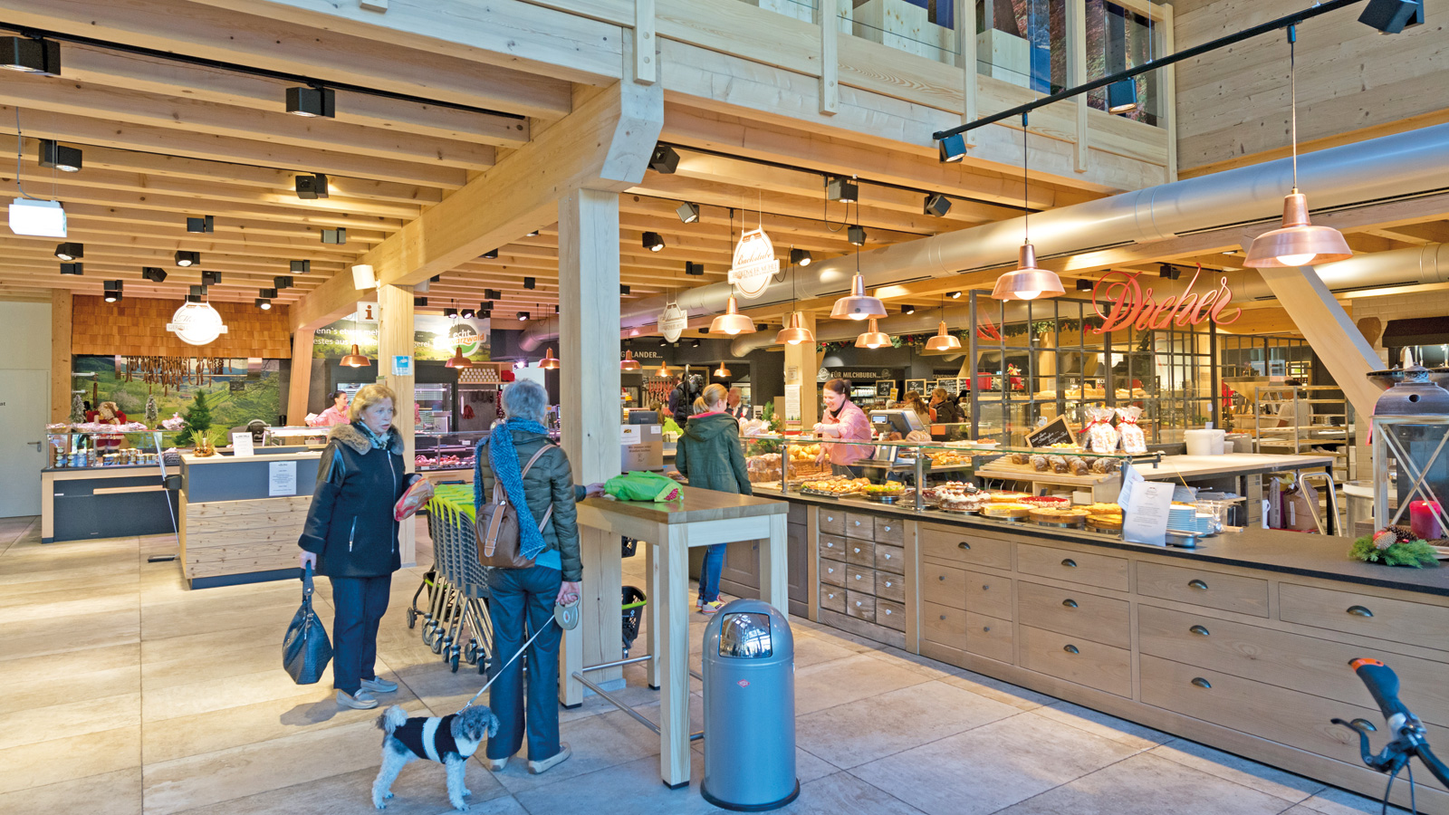 Behind the front of the front gable, a timber skeleton construction glazed to the apex, the actual market hall begins. The entrance area opens out into a space that extends vertically to the apex. Behind this is the open sales room with a ceiling that is supported by 240 x 680 mm thick glued laminated timber.