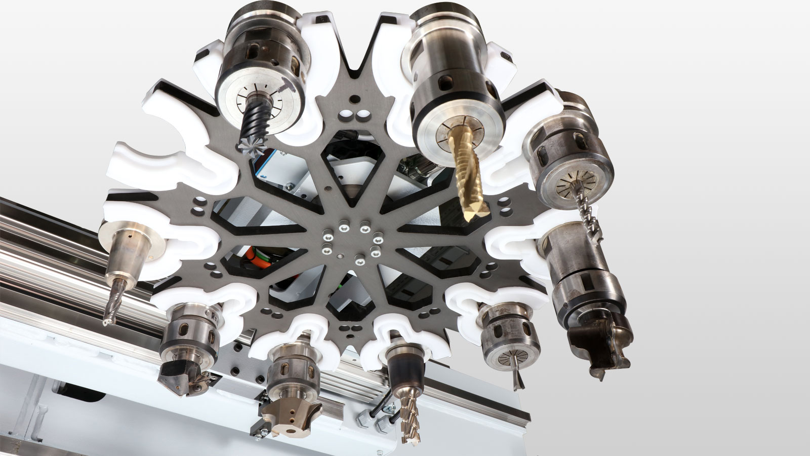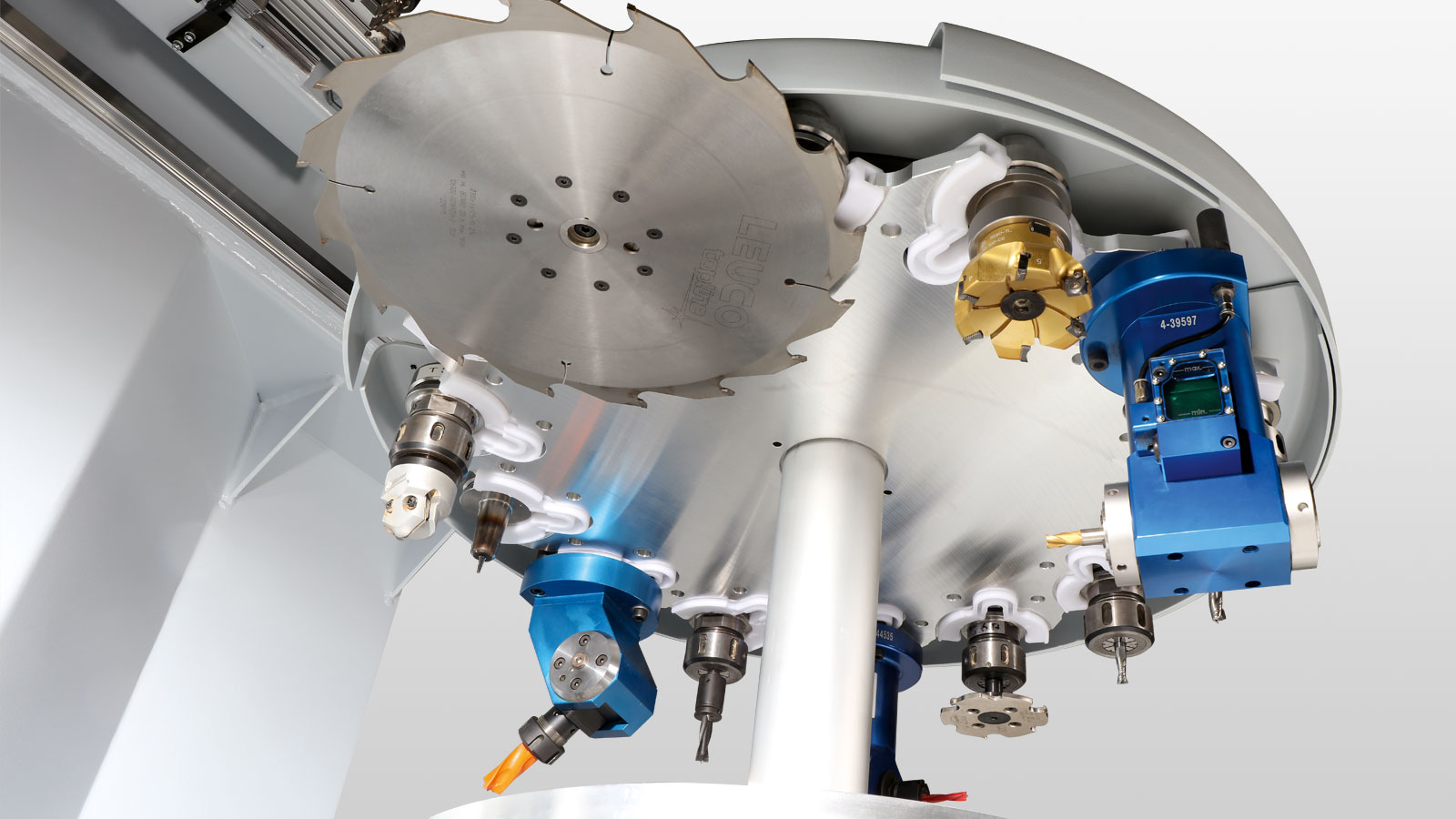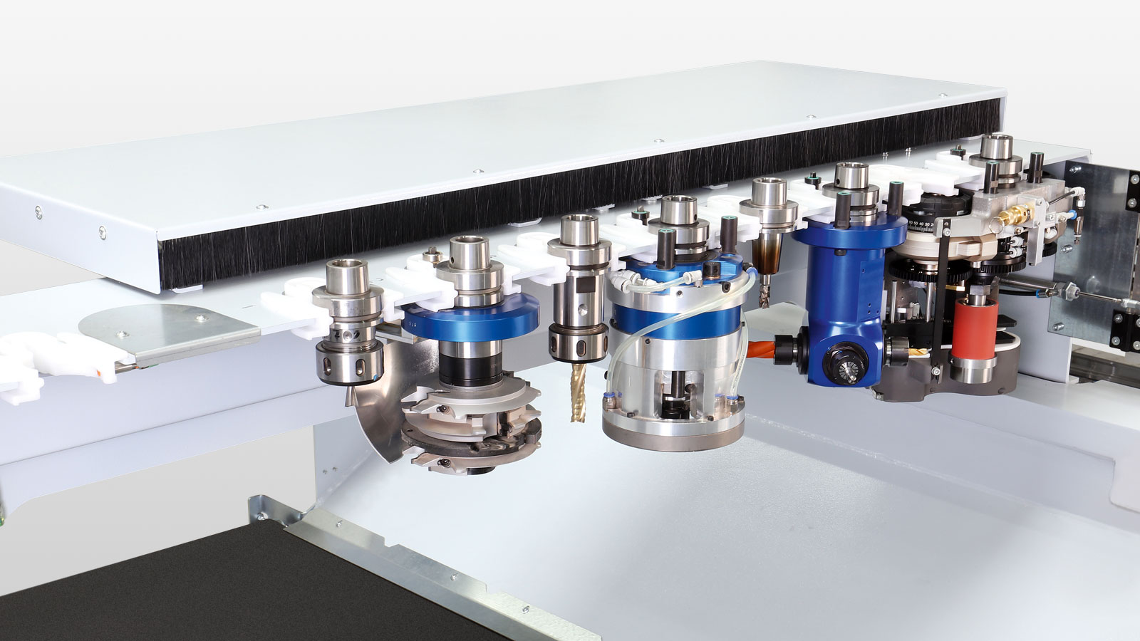 Pneumatikschnittstelle: Schnittstelle mit 3-fach-Abstützung an allen C-Achsen und optional an den DRIVE5 5- Achs-Köpfen ermöglicht den Einsatz getasteter Aggregate z.B. für exaktes Abrunden oben und unten unabhängig von Dickentoleranzen.