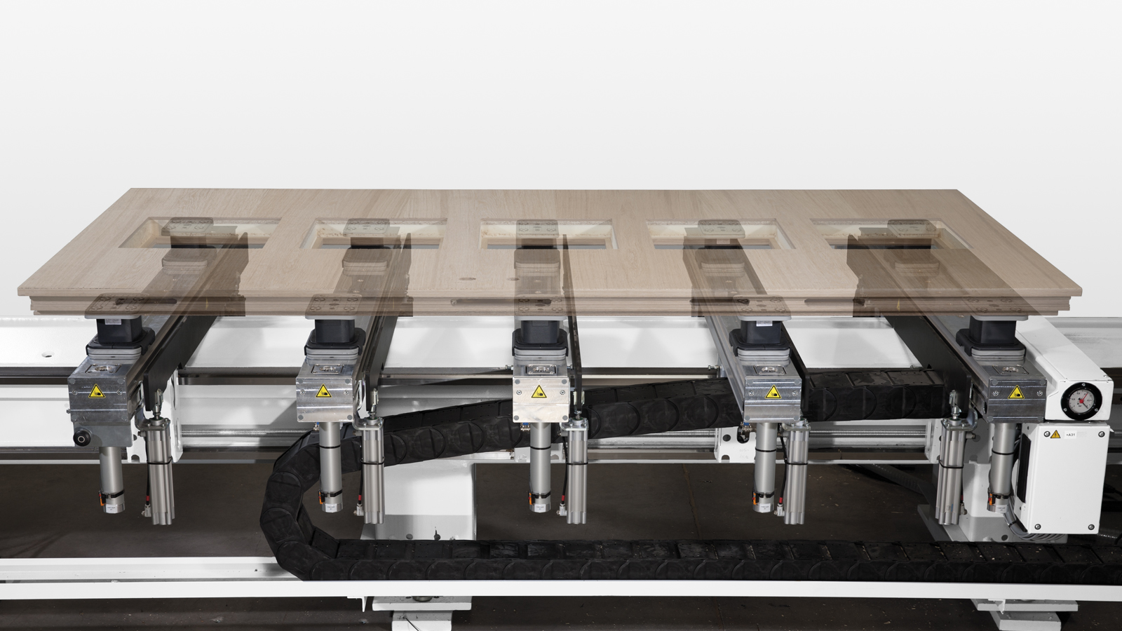 Optimale Bearbeitungsqualität durch Grundmaschine aus schwerer Portalbrücke sowie kompakter und steifer Führungsbahn für die Aufspanntische