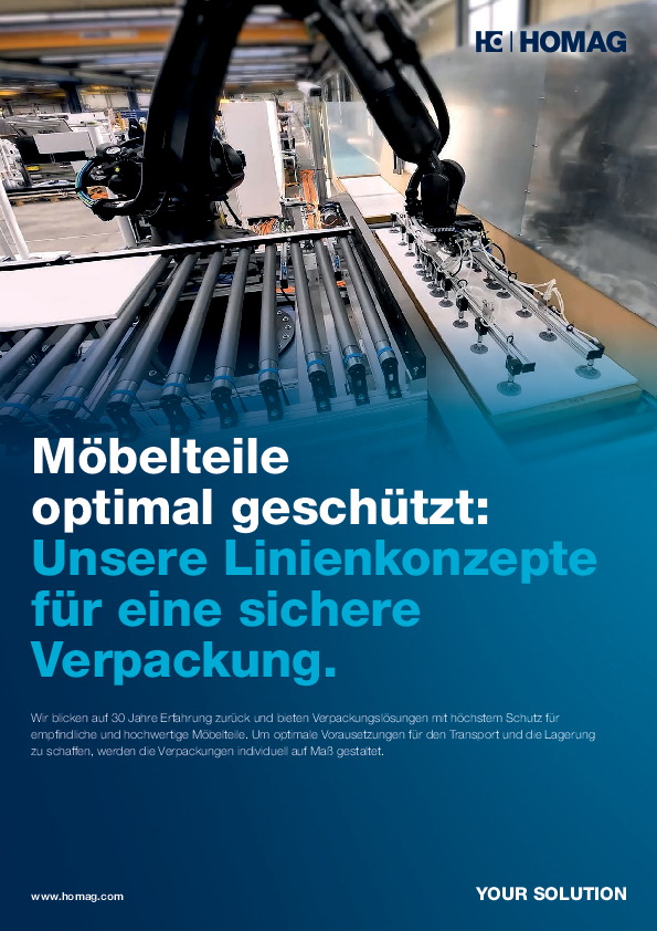 Die Linie bildet den kompletten Prozess der automatisierten Möbelverpackung vom Falten der Kartonage im FEFCO 0410 Design, über das Einlegen der Werkstücke und des Füllmaterials bis zum automatischen Verschließen, Verkleben und Abstapeln der Kartons ab.