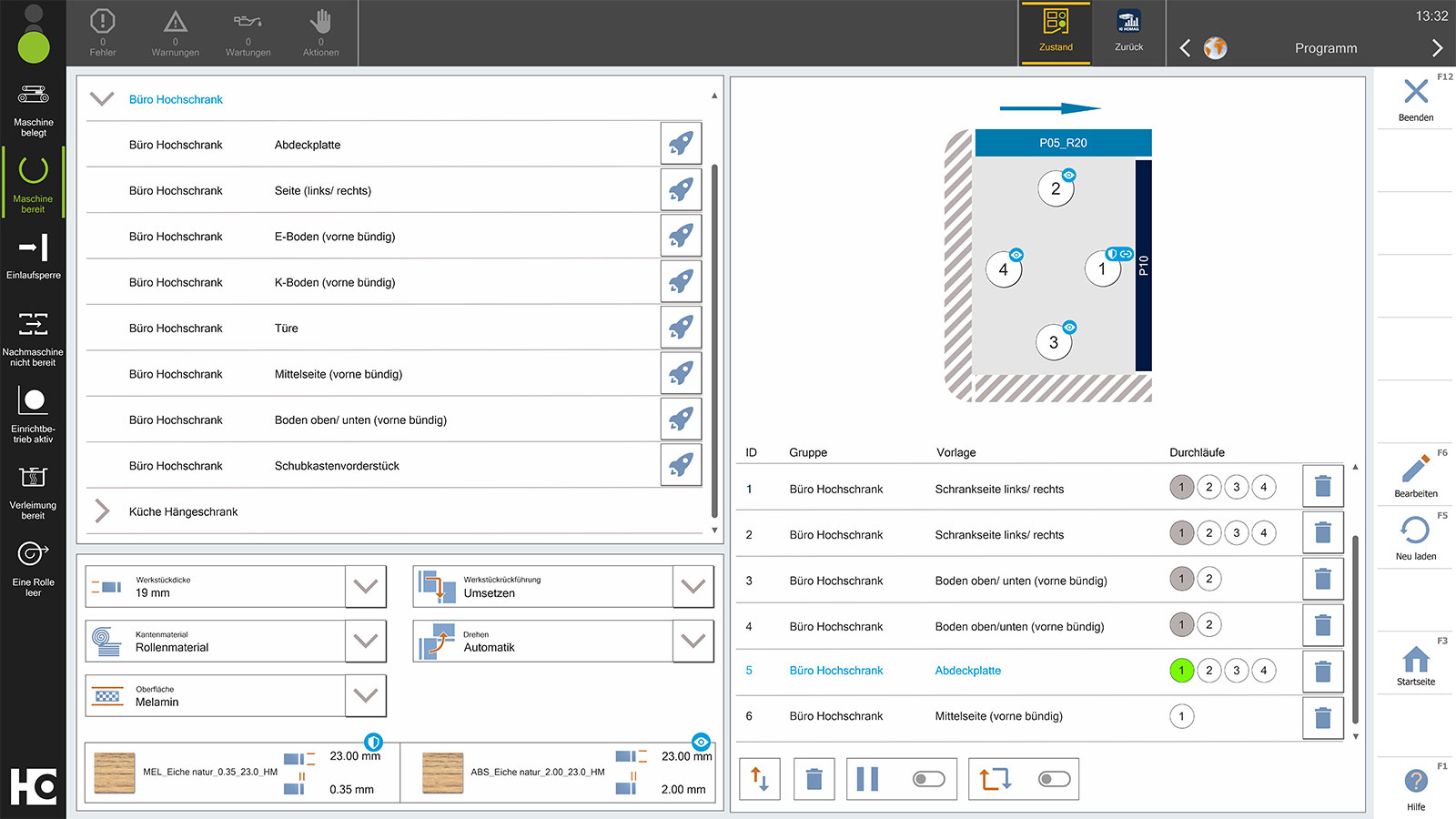 Software zur schnellen Auswahl der Bearbeitungsprogramme und des Kantenmaterials. Für sichere und schnelle Erfassung von Produktionsparametern sowie zum werkstückorientierten Erstellen von Maschinenprogrammen. Die neue Bedienplattform vereinfacht die Handhabung komplexer Maschinen durch Konsequente Digitalisierung und Vereinfachung der Bedienung, reduzierte Klicks mittels Programmverknüpfung und verbesserte Bedienerführung.