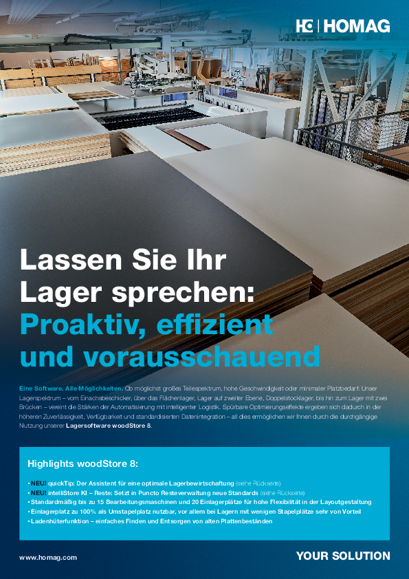 Mit woodStore 8 stellt HOMAG seinem gesamten Lagerspektrum eine intelligente Steuerung zur Seite. Sie verknüpft das Bestellwesen enger denn je mit der Auftragsbearbeitung, erfasst und analysiert automatisch sämtliche Ein- und Auslagerbewegungen, verwaltet Materialien bis zum Plattenrest und steuert den Materialfluss unter fortlaufender Selbstkontrolle. Mit ihren verschiedenen Funktionen schöpft die Lagersteuerung jederzeit und individuell das volle Lagerpotential aus.