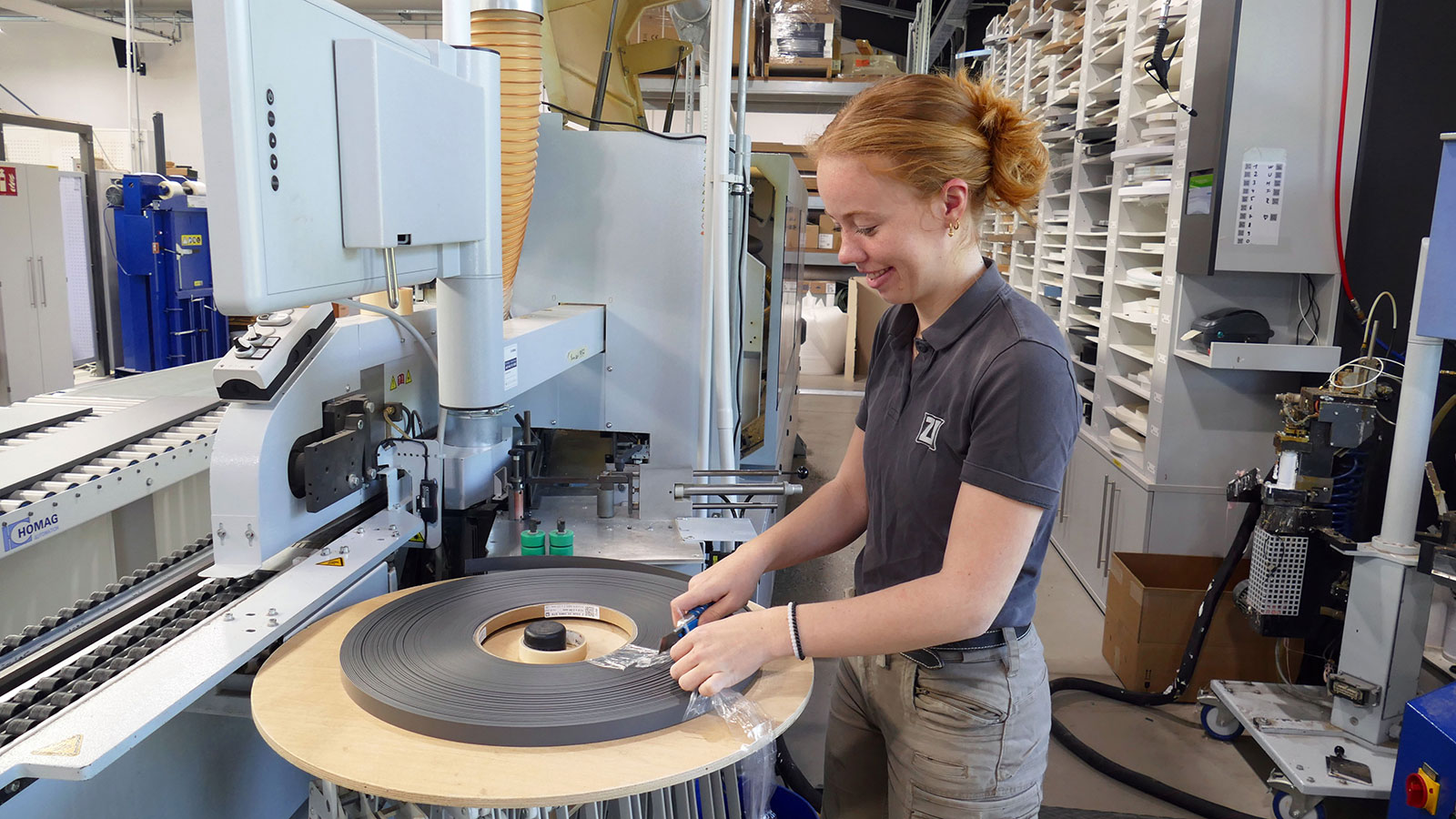 Neben dem außergewöhnlich hohen und langen Kantenbandregal, beeindruckt außerdem die Vielzahl an Kantenbändern, die in der Tischlerei bewältigt werden: ZB Holzsysteme führt über 1.000 verschiedene Kantenbandmaterialien und hat 700 Kantenbandrollen mit einer Gesamtlänge von über 32.000 Laufmetern auf Lager. „Seit der Einführung des Kantenband-Assistenten ist die Verwaltung dieser Mengen kein Problem mehr. Wir behalten immer den Überblick, wissen zu jeder Zeit, wo sich welches Kantenband befindet und wieviel Bestand wir noch im Lager haben“, erzählt Manuel zum Buttel.