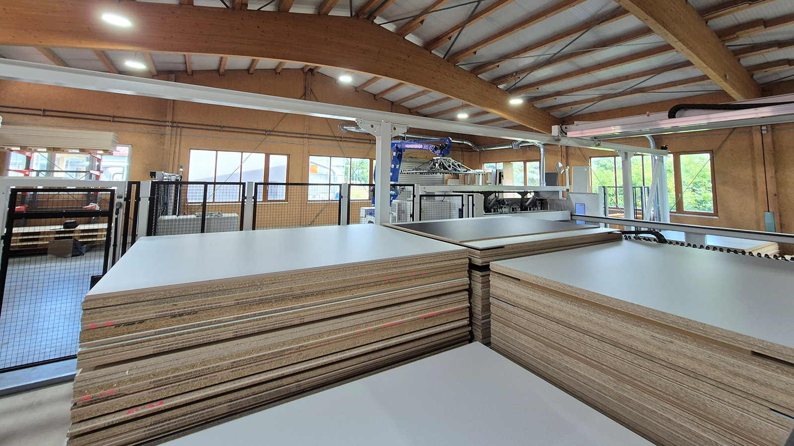 Seit Februar 2025 ist die „Sawteq S-300 Flex Tec“ mit Lager „Storeteq P-300“ in Betrieb. Sie ersetzt eine alte horizontale Plattensäge – ohne Roboter und ohne Lager. Durch die Automatisierung wird ein deutlich höherer Output erzielt. „Früher hatten wir ein Tageskontingent von maximal 25 bis 30 Platten. Das war für uns einfach zu wenig. Mit der neuen Robotersäge schaffen wir 60 Platten aufwärts in einer Schicht“, erzählt Christian Kern, Leiter AV und stellvertretender Betriebsleiter. Dadurch können die Arbeitsschritte entzerrt und die Mitarbeiter woanders effektiver eingesetzt werden. „Jetzt fahren wir nicht nur 8-Stunden-Schichten, sondern haben auch mal Zuschnitte, die über zwei Schichten oder bis in die Nacht rein laufen. Und der Mitarbeiter, der vorher ausschließlich zugeschnitten hat, bedient jetzt auch andere Maschinen.“