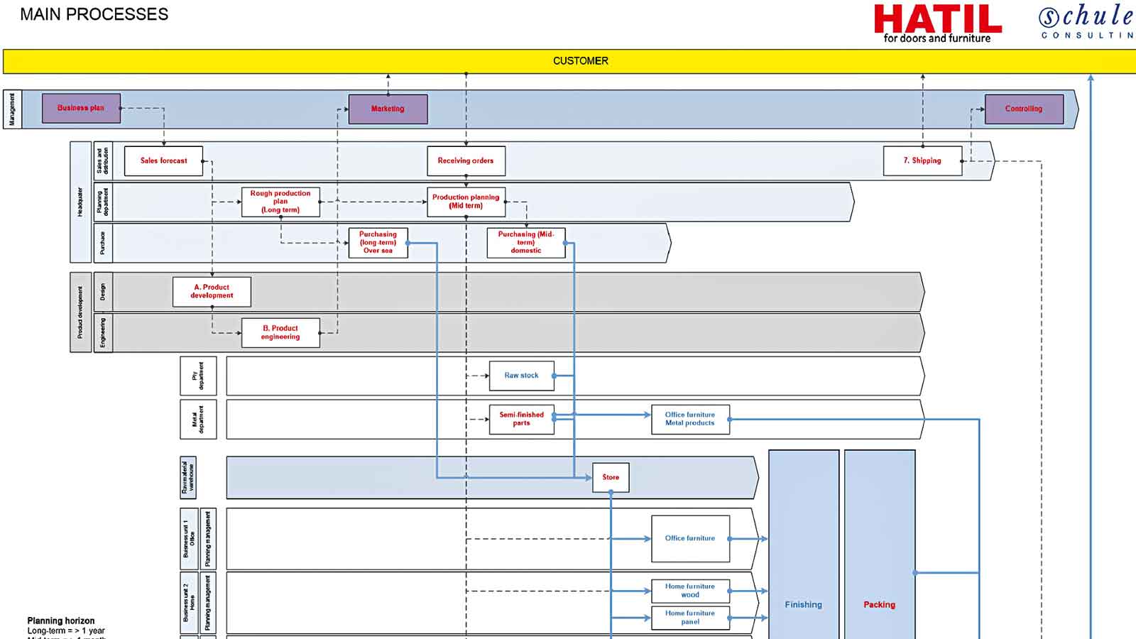 Hatil beauftragte Schuler Consulting, eine komplette Restrukturierung des Möbelgeschäfts durchzuführen. Die Durchlaufzeiten sollten reduziert, die Produktivität stark gesteigert werden und das Fertigwarenlager sollte dabei konstant groß bleiben. Das Projekt startete mit einer Vorstudie, aus der man einen langfristigen Entwicklungsplan für das Unternehmen konzipierte.