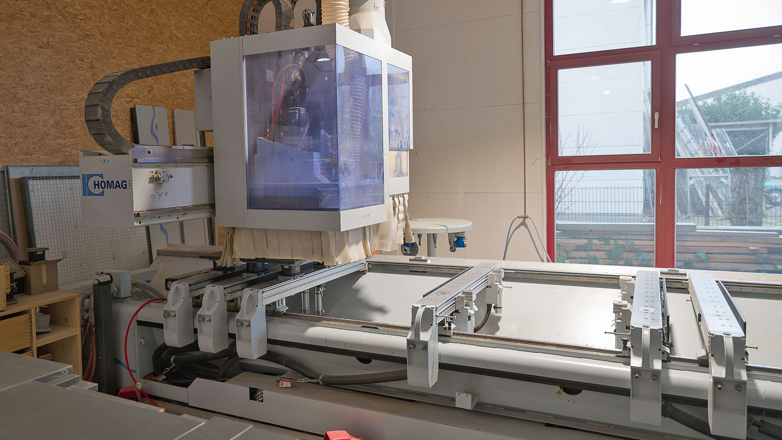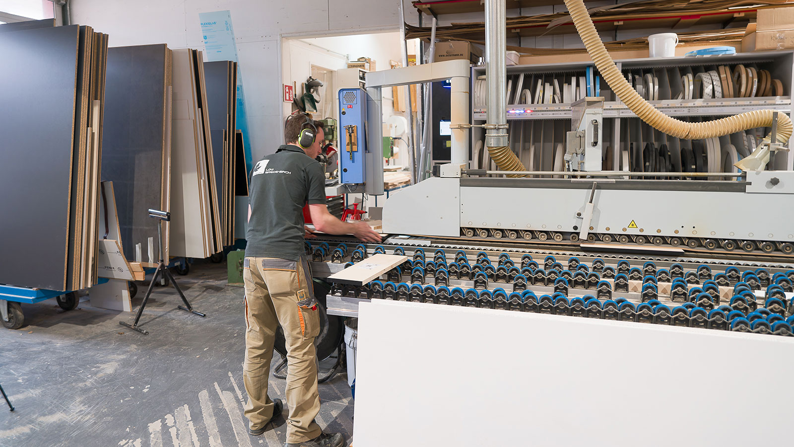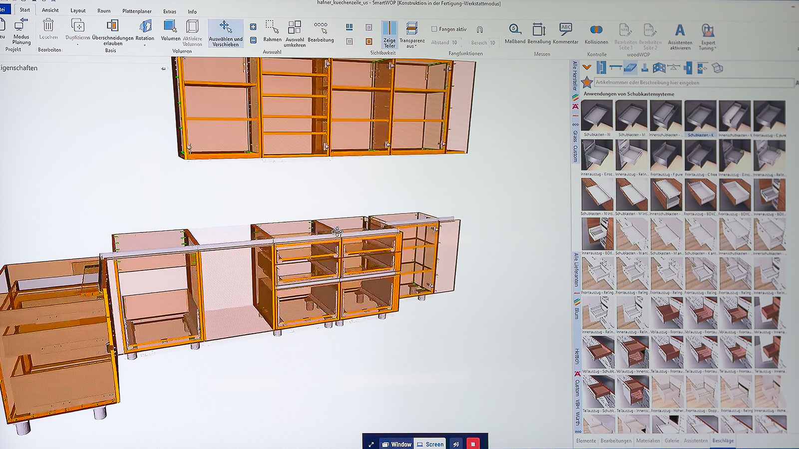 Die 2011 von Benjamin Löw und Thorsten Breidenbach gegründete Schreinerei mit rund 18 Mitarbeitern in Elchesheim-Illingen betreibt auf 750 m2 vor allem Möbel- und Messebau. Mit der bereits 2018 in Betrieb genommenen Software SmartWOP geht dem Tischlermeister Jonathan Henkenhaf das Konstruieren des Schrankes leicht von der Hand. Per Drag-and-Drop zieht er das Grund- oder Basisvolumen in das Bearbeitungsfenster und weist diesem die Maße seiner Aufmaßskizze zu. Weitere Elemente platziert er ebenfalls per Drag-and-Drop, fügt Beschläge und Materialien hinzu. Nach wenigen Minuten ist die Arbeit abgeschlossen und der Schrank konstruiert. Die CNC-Programme werden generiert und stehen direkt zur weiteren Bearbeitung bereit.