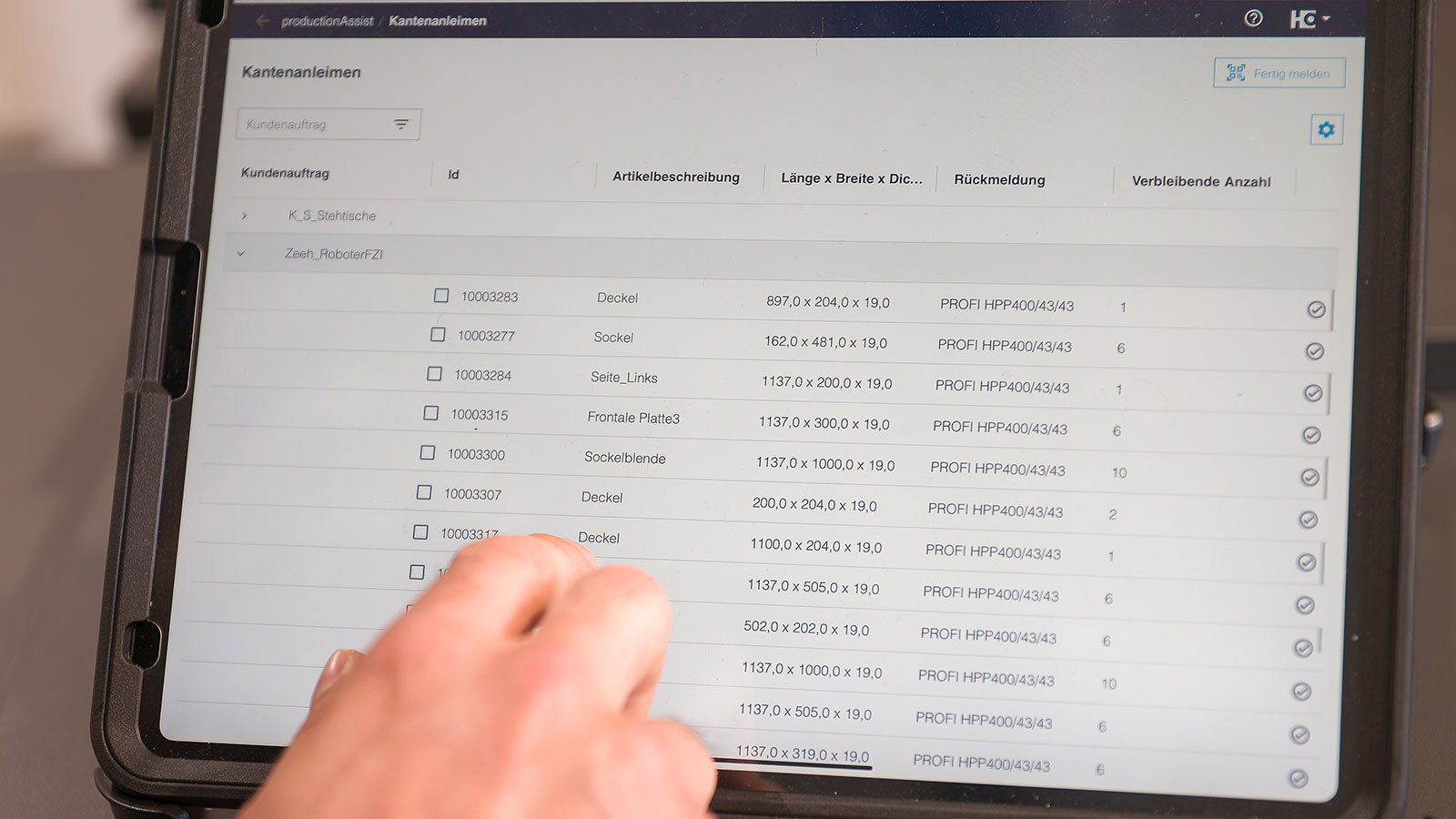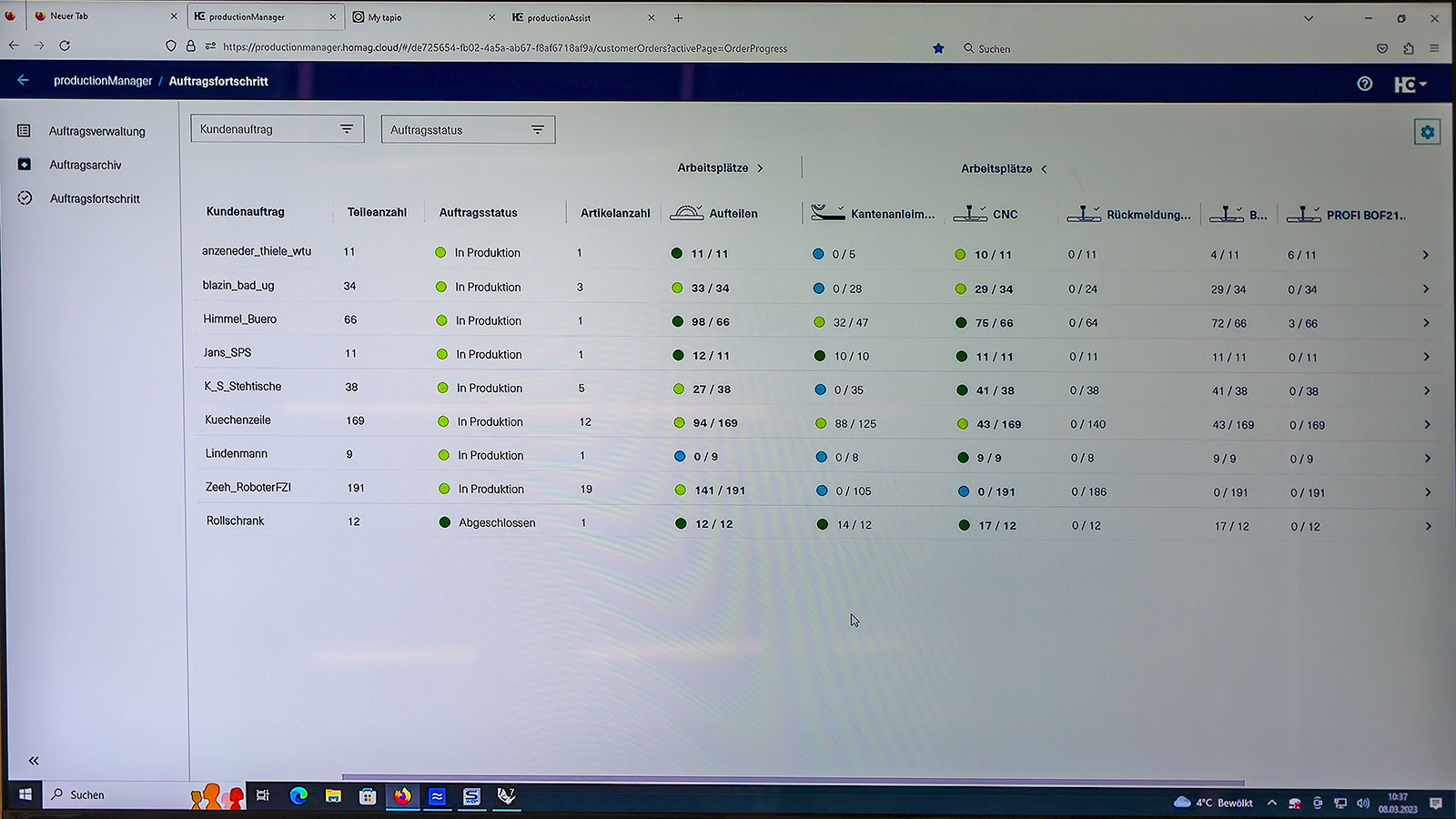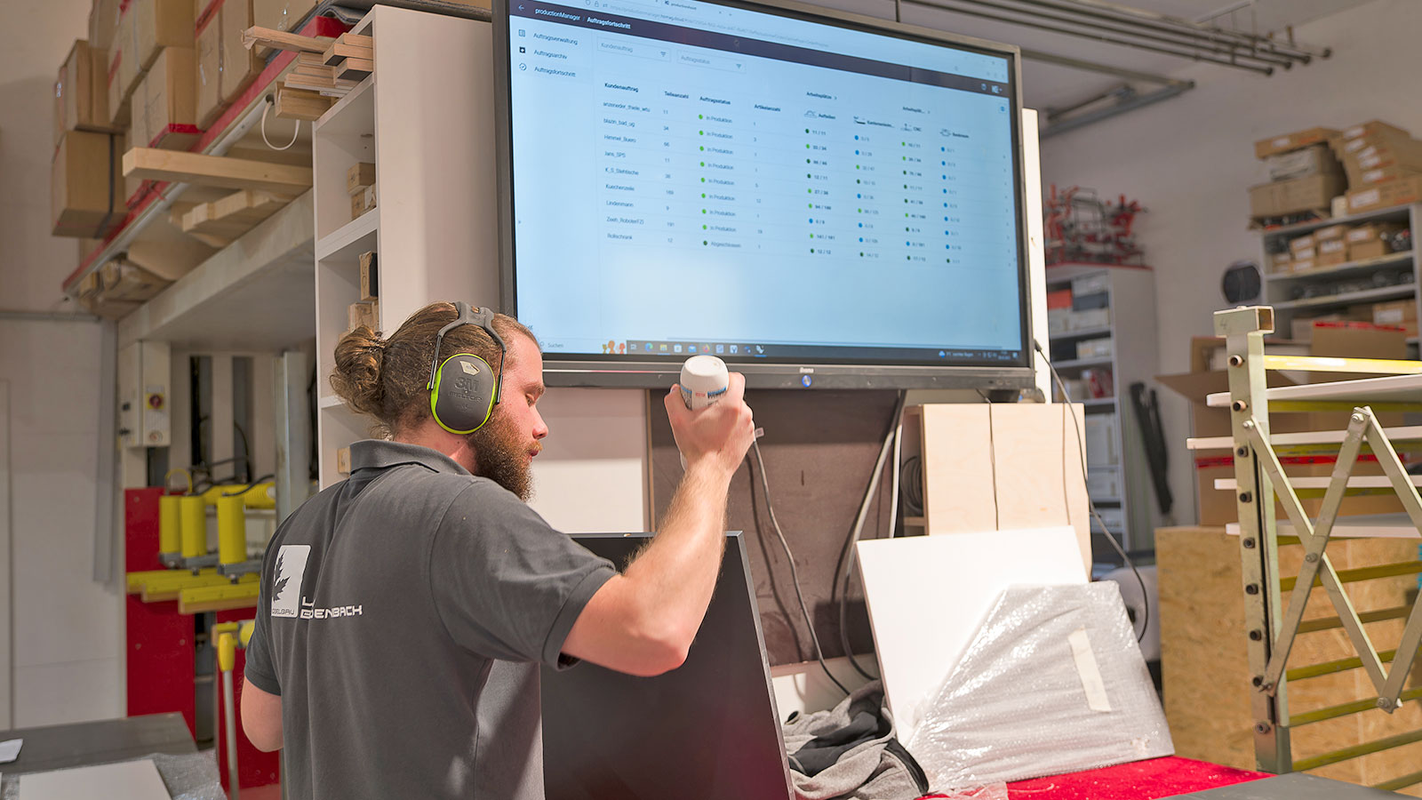 Das Löw-Breidenbach-Team hatte keinen Überblick mehr, welche Auftragspositionen wie weit abgearbeitet sind. Abhilfe schafft jetzt der productionManager. Mehrere Stationen in der Fertigung melden erledigte Bearbeitungen direkt automatisch oder manuell an den productionManager zurück. Die Plattenaufteilsäge und die CNC-Maschine machen das in der Schreinerei Löw Breidenbach heute schon automatisch. Für den Maschinenbediener entfallen somit manuelle Arbeitsschritte. An anderen Stationen, wie z. B. an der Kantenanleimmaschine oder in der Montage erfolgt die Rückmeldung über Tablets und Scanner. Der Bearbeitungsfortschritt ist automatisch in Echtzeit im productionManager verfügbar. Jeder Mitarbeiter, egal ob im Büro, in der Werkstatt oder auf Montage kann den Auftragsstatus und den Auftragsfortschritt zu jeder Zeit im Blick behalten.
