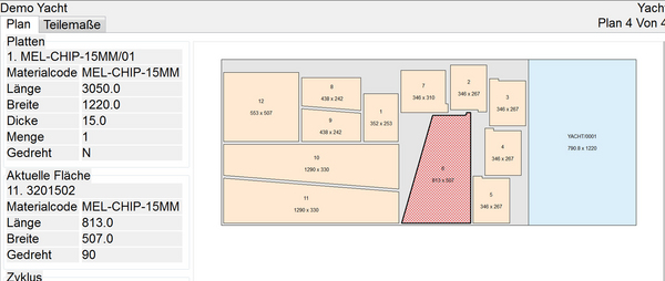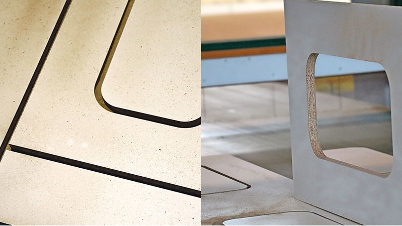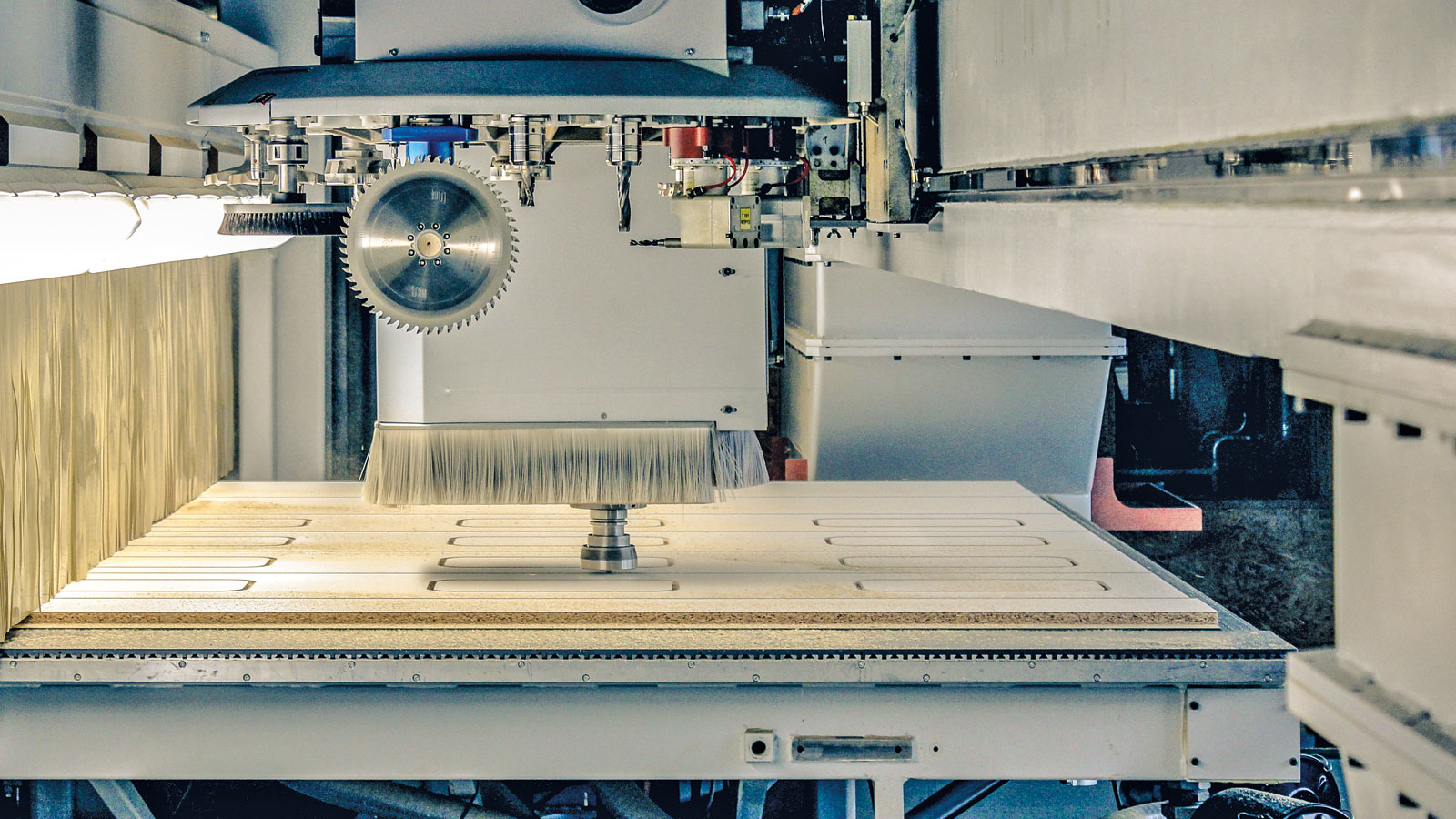 Um die Leckageverluste zu vermeiden, wollte er nicht komplett durch die Platte hindurchfräsen, sondern 2 mm Material stehen lassen und diese mit deutlich geringeren Schnittkräften in einem zweiten Durchgang wegfräsen. Auch die geringeren Schnittkräfte sollten den Vakuumhunger des Verfahrens stillen. Der Abstand zwischen zwei rechtwinkligen Teilen im Nest sollte außerdem exakt dem Durchmesser des Fräserpaars entsprechen, damit eine Fräsbahn zeitsparend gleichzeitig zwei Werkstückkanten erzeugt – die eine im Gleichlauf, die andere im Gegenlauf. Die HOMAG-Techniker sagten ihm, dass diese Technik in Amerika zwar praktiziert wird, sich damit aber keine guten Fräsqualitäten realisieren lassen. 2015 besuchte er seinen Werkzeuglieferanten Leuco zur Hausmesse und lernte die jüngste Version des P-System-Fräsers kennen: ein Diamant-Schaftfräser mit 12 mm Durchmesser. Die Schneiden stehen in einem großen Achswinkel und schneiden ziehend nach unten. Dank der Aerotec-Turbine fliegen die Späne trotzdem nach oben zur Absaugung. Die Schnittqualität ist hervorragend, egal ob bei Gleich- oder Gegenlauf. Dirk Schweinforth konnte Leuco gewinnen, zu diesem 12-mm-P-System-Fräser das passende Partnerwerkzeug zu bauen, das die stehengebliebenen 2 mm Restmaterial wegfräst. Das Verfahren hat er unter dem Namen »Schokoladenschnitt« zum Patent angemeldet und wendet es in seinem Betrieb erfolgreich an. Die drei vorhandenen Vakuumpumpen reichen jetzt völlig aus. Leuco liefert die Werkzeuge und schärft die Werkzeugpaare so nach, dass sie den gleichen Durchmesser haben. In der Nesting-Software Schnitt-Profi(t) von HOMAG ist für diese Arbeitsweise lediglich der Modus »Einfach Trennen« zu aktivieren.