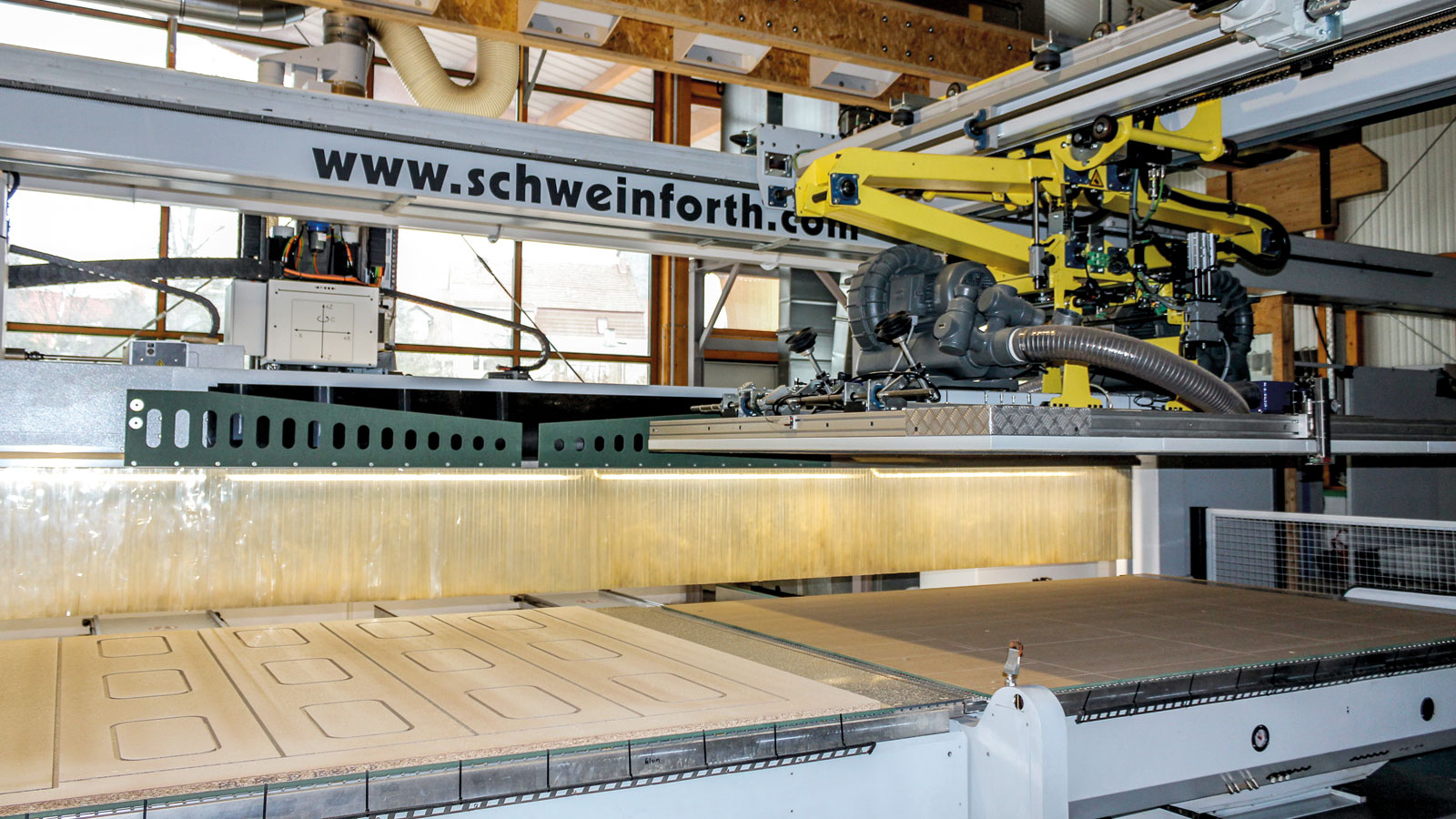 Selbst Drei Vakuumpumpen mit jeweils 6 kW und eine weitere mit 3 kW konnten die Leckageverluste beim Nesting-Fräsen in der Werkstatt von Dirk Schweinforth nicht so ausgleichen, dass der Betrieb ohne Leistungseinbußen lief. Der Zulieferer von Freiformteilen für die Möbelindustrie, Messebauer sowie Innenausbauer beschäftigt drei Mitarbeiter und verarbeitet täglich rund 25 Platten. 2009 investierte er im thüringischen Ohrdruf bei Gotha in die Nesting-CNC CENTATEQ T-Serie (BOF 722) von HOMAG. Zwei Tische und zwei Aggregaten ermöglichen den Wechselbetrieb. Schweinforth nutzt auch noch die Betriebsart Picken: rechts Plattenaufteilen, links das Komplettbearbeiten der Einzelteile. Der in die Maschinensteuerung eingebundene Vakuumheber kann, je nach gewählter Arbeitsweise, entweder für den Wechselbetrieb Halbformatplatten beziehungsweise später die kompletten daraus gefrästen Nester auf- und ablegen oder im Pickmodus einzelne Bauteile aus dem Nest herauspicken und auf dem Nachbartisch für weitere Bearbeitungen auf eine Schonerplatte ablegen. Ein besonders niedrig gebautes Winkelaggregat von Atemag kann trotz der Schonerplatte stirnseitig Dübelbohrungen einbringen.