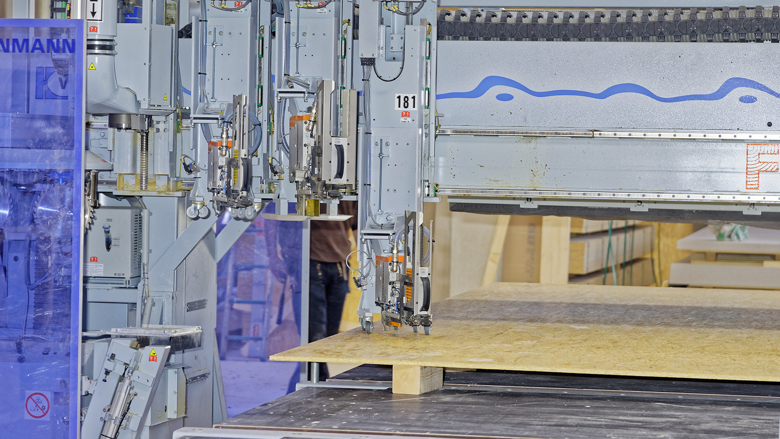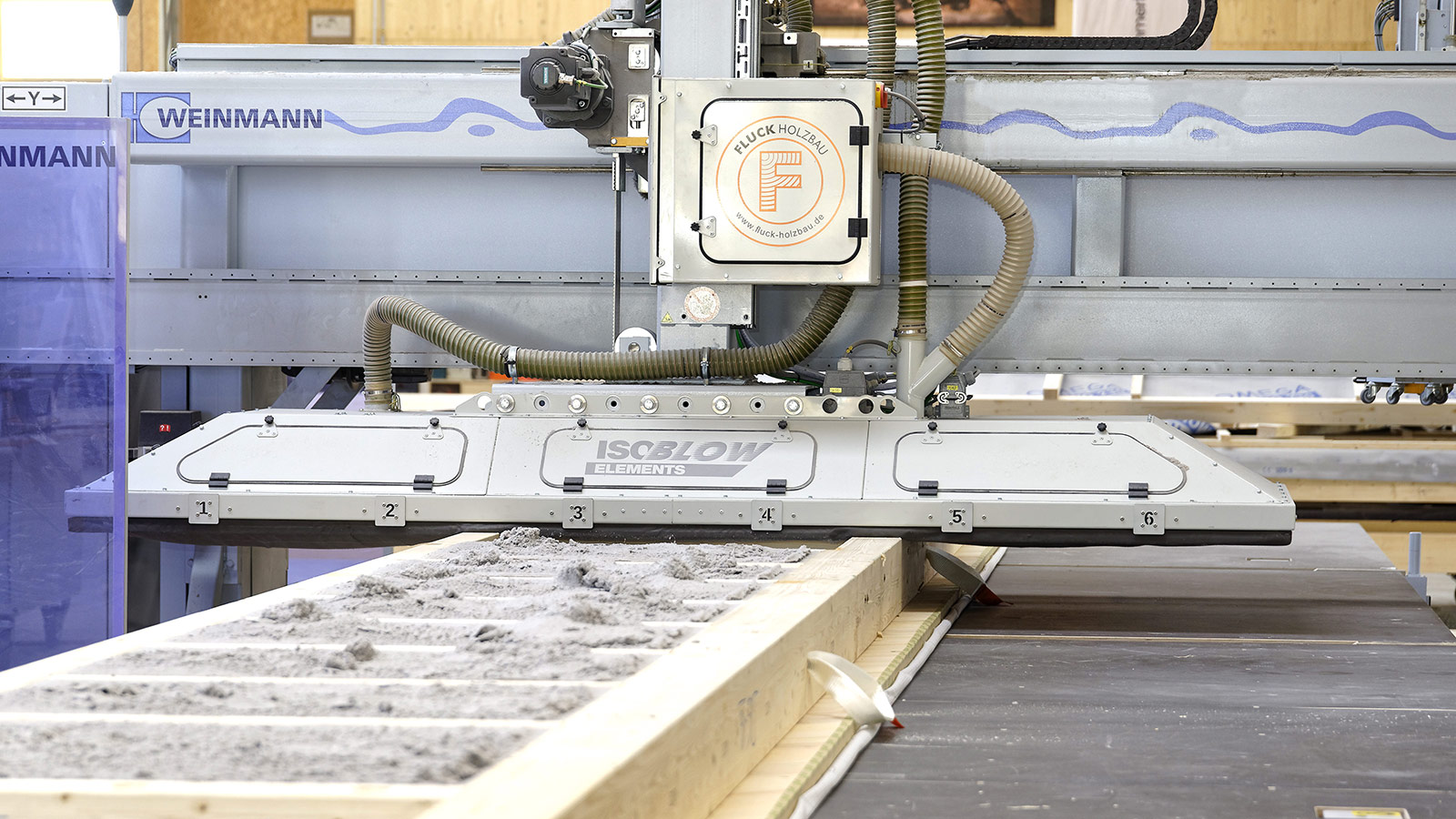 Zwar hatte WEINMANN damals gerade die erste reine Dämmbrücke zur Auslieferung im Werk stehen. Die von Fluck gewünschte Universalbrücke zur Elementbearbeitung und Dämmung war aber noch kein Thema. Deshalb entwickelte man in Lonsingen im engen Gespräch mit dem Zimmerer einen ganz auf seine Bedürfnisse zugeschnittenen Prototyp. Der könnte auch in anderen mittelständischen Betrieben zu einem Quantensprung in der Fertigung führen. Die WALLTEQ M-380 der Firma Fluck ist mit einer breiten Palette an leistungsstarken Holzbearbeitungsaggregaten ausgestattet: einer 18,5 kW Hauptspindel mit 12-fach Werkzeugwechsler, einer mitfahrenden Absaugung, zwei Klammergeräten für das schnelle Klammern von Plattenmaterialien und einem Gleitschuh für die schonende Befestigung von Holzweichfaserplatten. Hinzu kommt ein Pick-up Sägeaggregat für den schnellen und präzisen Zuschnitt. Die zusätzlich auf der WALLTEQ M-380 installierte Einblasplatte von Isocell bietet Florian Fluck die Möglichkeit, lose Dämmstoffe im Fertigungsprozess vollautomatisch in seine Holzkonstruktionen einzubringen. Dabei übernimmt die Multifunktionsbrücke die Aufgabe der korrekten Positionierung und der Datenübergabe via Schnittstelle, während die Einblasplatte als autonome Einheit für das Einblasen der unterschiedlichen Gefache zuständig ist. Auch kleine Gefache und Sonderformen wie Giebelelemente sind möglich. Die neue Fertigungsanlage bietet Fluck eine Vielzahl von Vorteilen. Dazu zählen unter anderem die automatische Kontrolle der Dämmstoffverdichtung per Wiegeeinheit und die Möglichkeit der Sichtkontrolle nach Abschluss des Dämmvorgangs, außerdem eine Steigerung der Effizienz und eine hohe Flexibilität bei der Wahl der Dämmstoffe. Möglich sind zum Beispiel Mineral- und Holzfasern sowie Zellulose, die man bei Fluck bevorzugt. Ein spezieller Vorteil der Kombi-Variante liegt in ihren kurzen Standzeiten. Bereits heute ist die WALLTEQ M-380 bei Fluck Holzbau in permanentem Einsatz, kann auf den beiden Tischen zügig zwischen Dämmung und Elementbearbeitung pendeln. Die kurzen Arbeitspausen werden weiter schrumpfen, wenn Fluck demnächst auch die Innenwände geschlossen fertigt.