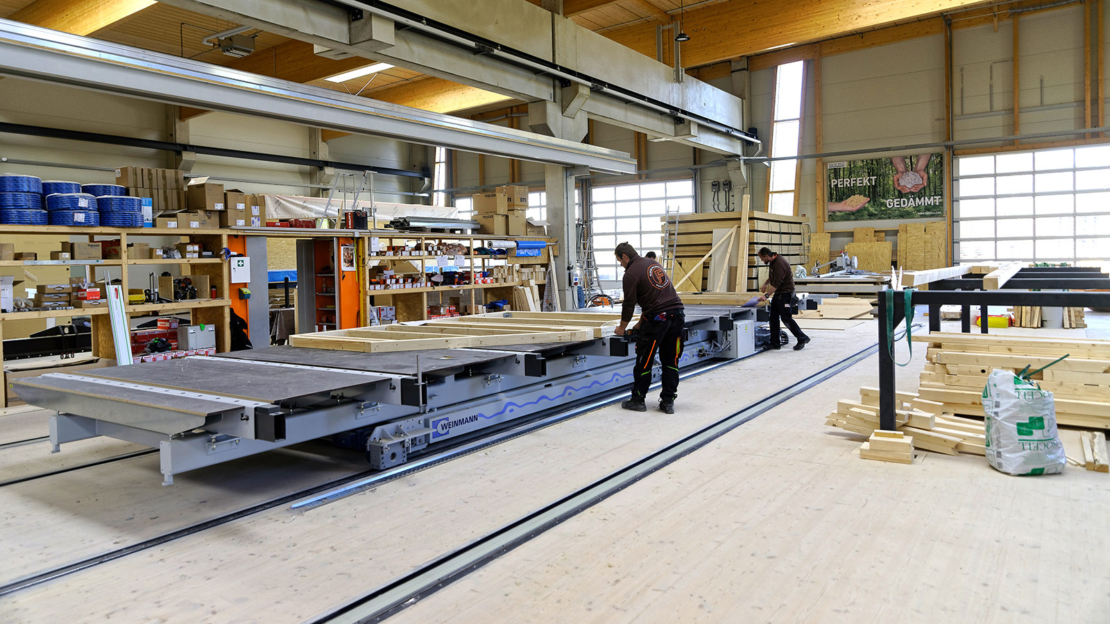 Parallel zum Hallenneubau plante der Zimmerer eine technische Modernisierung: "Weil klar war, dass wir so nicht weitermachen konnten. Wir fertigten unsere Holzhauselemente liegend und transportierten sie einseitig beplankt zur Baustelle, wo wir sie montierten, dämmten und schlossen. Dadurch haben wir viel Geld verschenkt. Außerdem wollten wir wachsen. Dafür brauchten wir mehr Kapazität, eine effiziente Produktion, neue Mitarbeiter - also auch attraktive Arbeitsplätze - ein optimiertes Qualitätsmanagement und, und, und..." Angesichts der guten Auftragslage dachte Florian Fluck "an eine neue Abbundanlage und eine Multifunktionsbrücke von WEINMANN. Beide zeitgleich zu kaufen war aber eine zu große Investition." Da er mit einem sehr guten Abbundzentrum zusammenarbeitet, investierte er zunächst in eine Multifunktionsbrücke und zwei Arbeitstische. Auch die Eindrücke aus einigen Betriebsbesichtigungen sprachen dafür, aber: "Meine Multifunktionsbrücke sollte in jedem Fall auch die Dämmung einblasen können."