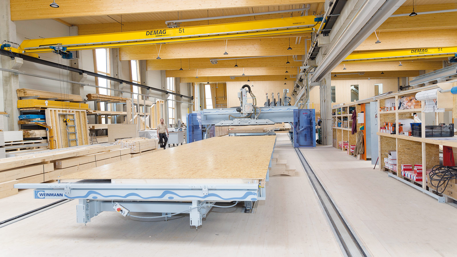 Angesichts reger Bautätigkeit, steigender Marktanteile und voller Auftragsbücher ist der Holzbau auf Wachstumskurs. Zu den Vorreitern dieses Trends dürfte Fluck Holzbau im badischen Blumberg gehören. Gründer Florian Fluck, 2007 in den Holzbau eingestiegen, hat im Jahr 2017 rund 40 Häuser im eigenen Unternehmen produziert. Dies in einer 2016 gebauten, 70 x 50 m großen Halle, in der eine WEINMANN WALLTEQ M-380 ein weltweites Novum präsentiert. Diese Multifunktionsbrücke kann Holzelemente nicht nur in bekannter Manier bearbeiten, sie übernimmt mit einer integrierten Einblasplatte auch die vollautomatische Dämmung.