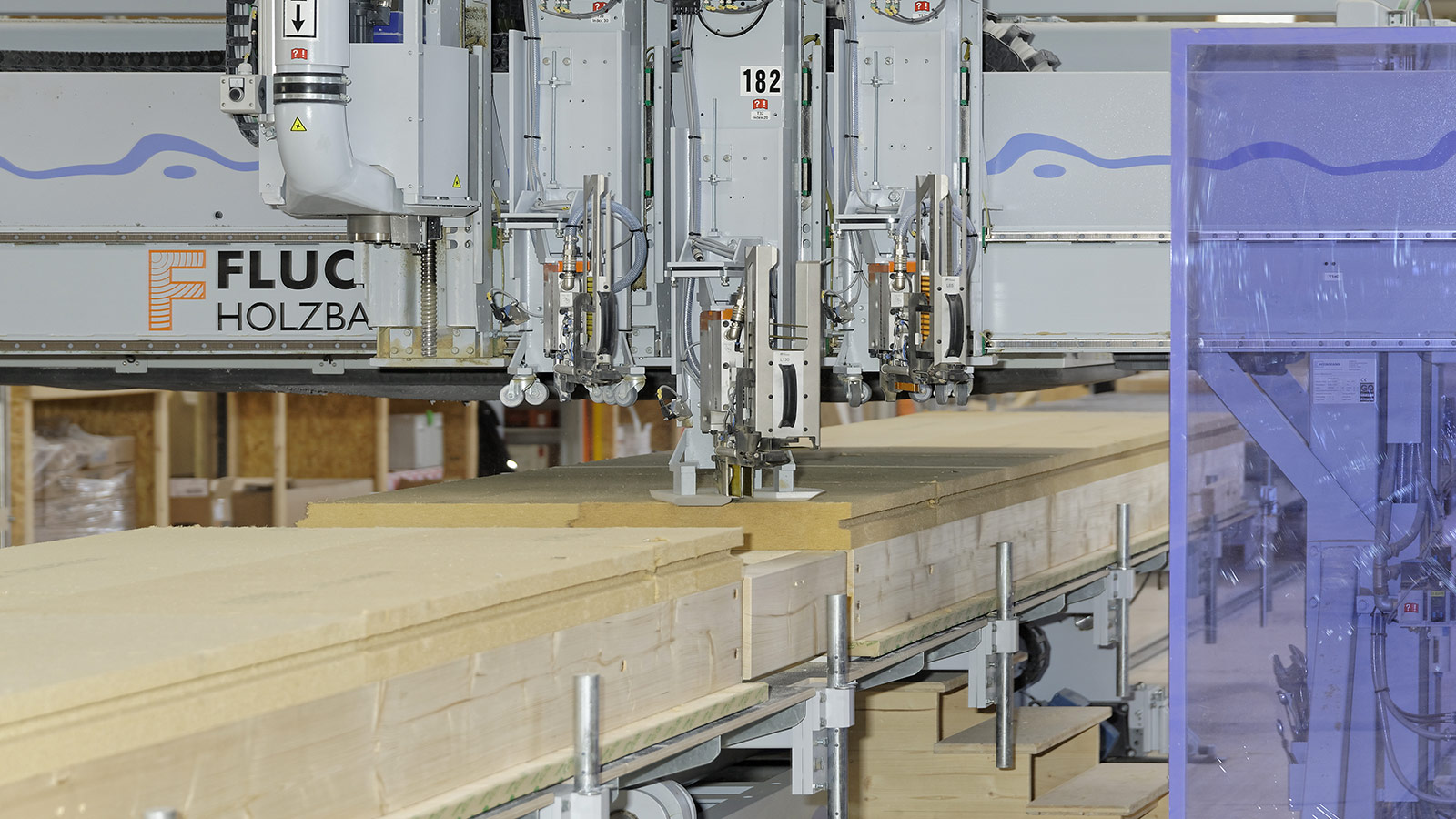 Auch die Kunden sind von der technischen Weiterentwicklung sehr angetan. Fluck macht heute mit jedem Interessenten eine Werksführung, "und jeder ist am Ende begeistert über das professionelle Niveau, auf dem wir unsere Holzhäuser bauen." Diesen Werbeeffekt hält Fluck für einen Nutzen der Maschine, den man nicht unterschätzen sollte. Die Kombination aus Bearbeitung und Dämmung funktioniert in seinen Augen "genau so, wie ich es haben wollte. Wir haben mit der Maschine absolut perfekte Arbeitsergebnisse mit geringer Fehlerquote, kein Nachbessern, die Bauteile sind extrem maßhaltig. Die Anlage arbeitet effizient und verlässlich, die Wertschöpfung ist dank hohem Vorfertigungsgrad erheblich gestiegen." Ähnlich positiv sieht er die Möglichkeit, heute auf kurzfristige Anfragen schnell und flexibel reagieren zu können. "Zusammen mit dem durch die Technik optimierten Qualitäts-, Zeit- und Kostenmanagement sichert uns das die Aufmerksamkeit von Bauträgern und Architekten, die auch an unserer Kompetenz im Schall- oder Brandschutz interessiert sind." Einige Eisen dieser Art hat man in Blumberg bereits im Feuer, zunächst steht allerdings eine Phase der Konsolidierung an. "Jetzt muss sich alles setzen, einspielen und effizienter werden. Außerdem müssen wir die Kompetenzen so verteilen, dass der Geschäftsführer nicht mehr für alles verantwortlich ist". Florian Fluck selbst kann sich dann dem Kundengespräch in den hochwertigen ausgestatteten Beratungsräumen seines Unternehmens widmen. Und den Plänen für ein neues Materiallager. Das alte war beim Einzug in die neue Halle schon wieder zu klein.