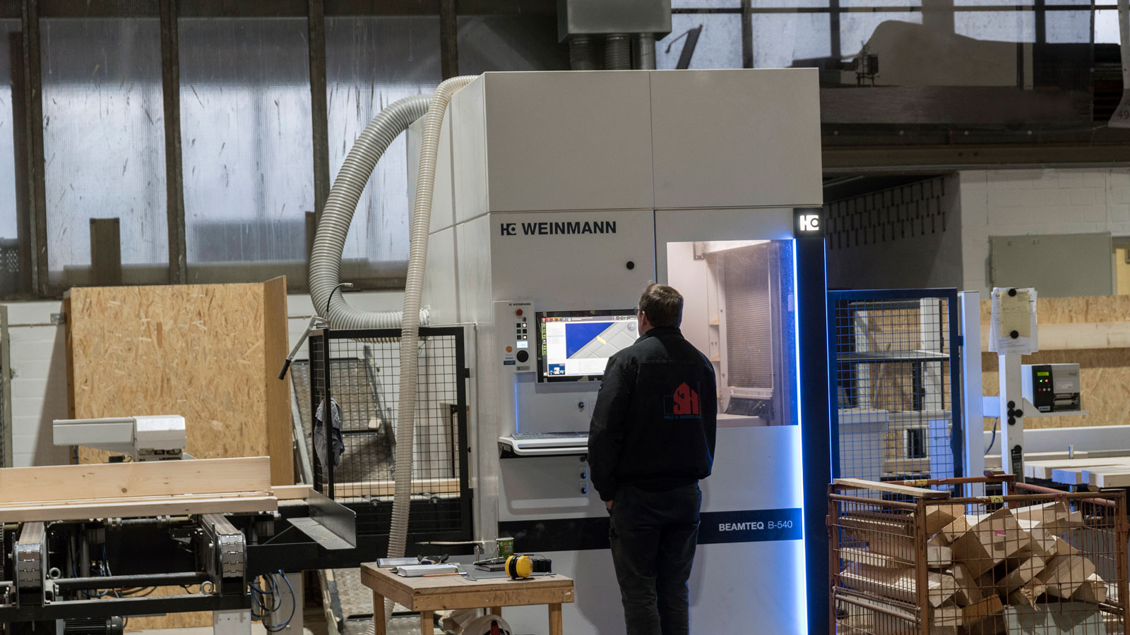 Stefan Höötmann lässt sich ungern von der Arbeit abhalten. Als er sich entschlossen hatte, die Elementfertigung in seiner SH Holz & Modulbau GmbH zu automatisieren, akzeptierte er deshalb keine Verzögerung durch Lieferzeiten: „Die WEINMANN-Selbstbautische hatten wir sofort am Start, auf unsere Multifunktionsbrücke – eine WALLTEQ M-380 – können wir etwas warten, weil wir ja bislang schon manuell produziert hatten.“ Seine Abbundanlage wollte der Unternehmer aber sofort: „Da hatte ich die Einstellung: Wenn ich keinen Mercedes kriege, komme ich auch mit einem VW ans Ziel. Deshalb hatte ich mir schon in Italien eine gebrauchte Abbundanlage angeschaut und war kurz davor, sie zu kaufen. Bei der reinen Absicht blieb es dann aber auch, denn Weinmann machte Stefan Höötmann ein Angebot, das er nicht ablehnen konnte: „Man stellte mir leihweise eine andere Abbundanlage in die Halle – für mich eine Superlösung, die auch optimal abgewickelt wurde: Wenn meine BEAMTEQ B-660 kommt, wird die Leihmaschine abgeholt und weiterverkauft. So etwas liebe ich: wenn nach Lösungen gesucht wird, statt nur die Probleme herunterzubeten. Und diese Lösung passte perfekt.“