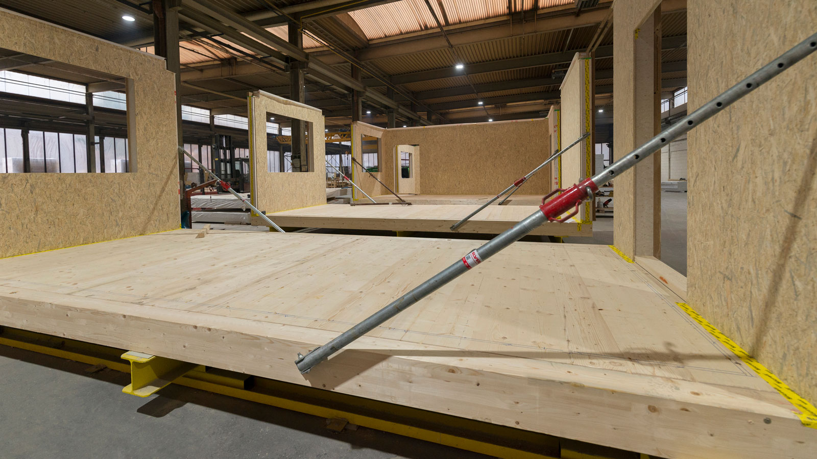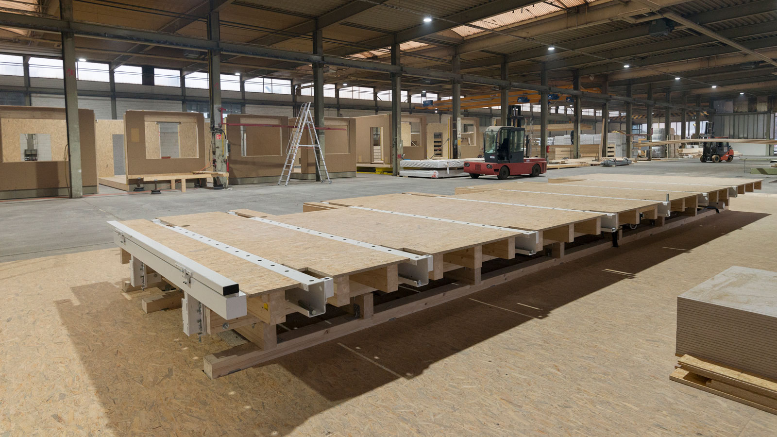 Zentrale Voraussetzung all dieser Vorteile ist eine konsequente Industrialisierung der Bautätigkeit. Ist sie umgesetzt, wird ein Modulgebäude zum Produkt, das unter kontrollierten Rahmenbedingungen gefertigt und als Komplettleistung an seinen Bestimmungsort geliefert wird. Die Bautätigkeit vor Ort reduziert sich auf ein kurzes Zeitfenster für die Montage, die Abhängigkeit von äußeren Einflüssen wie der Witterung oder negativen Wechselwirkungen zwischen den einzelnen Gewerken sinkt gegen Null. Im Zentrum des Bauprojekts steht neben der Planung und Arbeitsvorbereitung die Fertigung der Module in der Halle, die nach dem Vorbild der Automobilindustrie weitgehend automatisiert und rationalisiert werden sollte. Industrielles Bauen macht es dann auch möglich, die Synergieeffekte der Standardisierung und Serialität konsequent zu nutzen. Nicht umsonst hat Stefan Höötmann bei der Produktion von 13 baugleichen Flüchtlingsheimen die Erfahrung gemacht, „dass wir durch die Wiederholung der immer gleichen Abläufe weniger fehleranfällig waren und Arbeitszeiteinsparungen von bis zu 30 Prozent zu verzeichnen hatten. Das haben wir gemessen, da muss der Weg für uns hingehen. Mit einer automatisierten Fertigung werden wir diese Synergieeffekte künftig noch gründlicher ausschöpfen können.“ Die Kontaktaufnahme mit dem Maschinenbauer WEINMANN, der als Teil der HOMAG Group für die Automatisierung im Holzbau steht, war unter diesem Aspekt ein weiterer Schritt in die richtige Richtung. Für Stefan Höötmann ist er Teil seines Bestrebens, „alle Prozesse rund um den Bau selbst in der Hand zu haben und konsequent zu optimieren. Im Bereich der Produktion bedeutet dies einen schnelleren Workflow durch automatisierte Fertigung, außerdem höhere Stückzahlen bei schneller Reaktion auf Auftragsspitzen. Nicht zu vergessen die höhere Qualität – manuell wurden bei uns immer noch zu viele Fehler gemacht.“ Auch in der der Modulmontage will der Zimmermann künftig weitere Rationalisierungspotentiale nutzen: „Momentan stellen wir die Module noch in der Halle ab, montieren sie, bauen sie aus, verpacken sie und transportieren sie ab. So kriegen wir die Module erst raus, wenn sie alle fertig sind – wenn es bei einem ein Problem gibt, ist die ganze Halle blockiert.“ Ein System, das lange funktioniert hat, bei den heutigen Volumina aber an seine Grenzen stößt. Ab 2023 Jahr will das Unternehmen deshalb ein Schiebesystem etablieren, mit dem man die Module durch die Halle fahren kann. „Dann kommen sie zum Handwerker, der in der Halle eine feste Station hat. So können wir jeden Tag ein Modul fertigstellen und draußen lagern.“ Damit hätte die SH Holz & Modulbau GmbH ihre Hausaufgaben gemacht. Im Bereich der Fremdgewerke sieht Stefan Höötmann allerdings noch Nachholbedarf: „Auch die Nachunternehmer haben ja Einsparungen durch die rationale Arbeit in unserer Halle. Allerdings hat sich hier noch nicht die Erkenntnis durchgesetzt, dass man zumindest einen Teil dieser Einsparungen in eine Verbesserung der Kostenstruktur einfließen lassen könnte.“ Darüber hinaus könnten Elektriker und Installateure Kabel- oder Leitungsstränge vorfertigen und in der Halle einbauen. „So könnten sie zusätzliche Kostenpotentiale nutzen, aber leider fehlt vielen Handwerkern dafür noch das Verständnis. Dennoch bin ich überzeugt: Wenn wir beim Modulausbau weitere Schritte in die richtige Richtung machen und darüber hinaus die Möglichkeiten von Großmengenrabatten intensiv nutzen, wird der konventionelle Massivbau immer weniger mit uns mithalten können.“